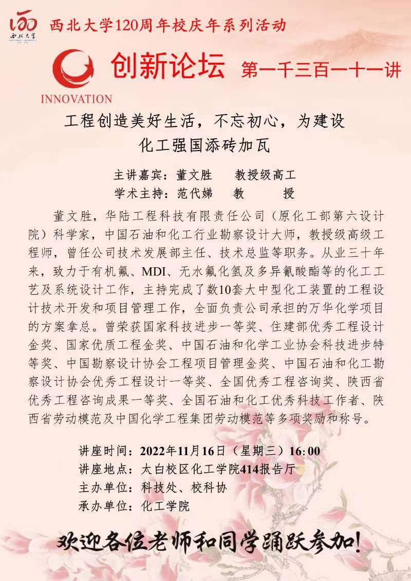 董文胜 教授级高工 BB平台创新论坛第一千三百一十一讲暨120周年校庆年系列活动: 工程创造美好生活,不忘初心,为建设化工强国添砖加瓦 讲座时间 2022年11月16日(星期三)16:00 讲座地点 太白校区化工学院414报告厅 讲座人介绍 董文胜 教授级高工 讲座内容
