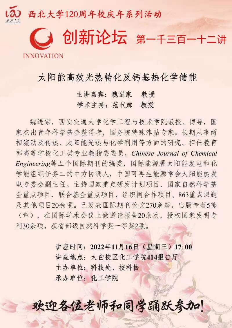 魏进家 教授 BB平台创新论坛第一千三百一十二讲暨120周年校庆年系列活动:太阳能高效光热转化及钙基热化学储能 讲座时间 2022年11月16日(星期三)17:00 讲座地点 太白校区化工学院414报告厅 讲座人介绍 魏进家 教授 讲座内容