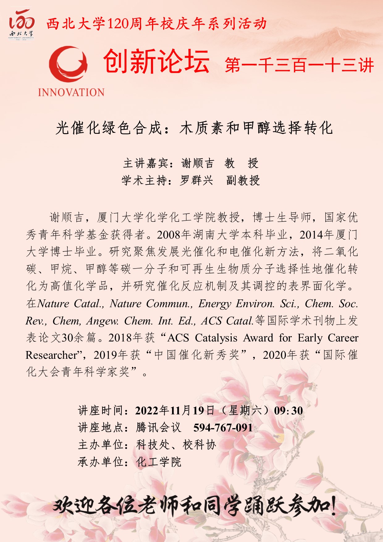 谢顺吉 教授 BB平台创新论坛第一千三百一十三讲暨120周年校庆年系列活动: 光催化绿色合成:木质素和甲醇选择转化 讲座时间 2022年11月19日(星期六)09:30 讲座地点 腾讯会议( 594-767-091) 讲座人介绍 谢顺吉 教授 讲座内容