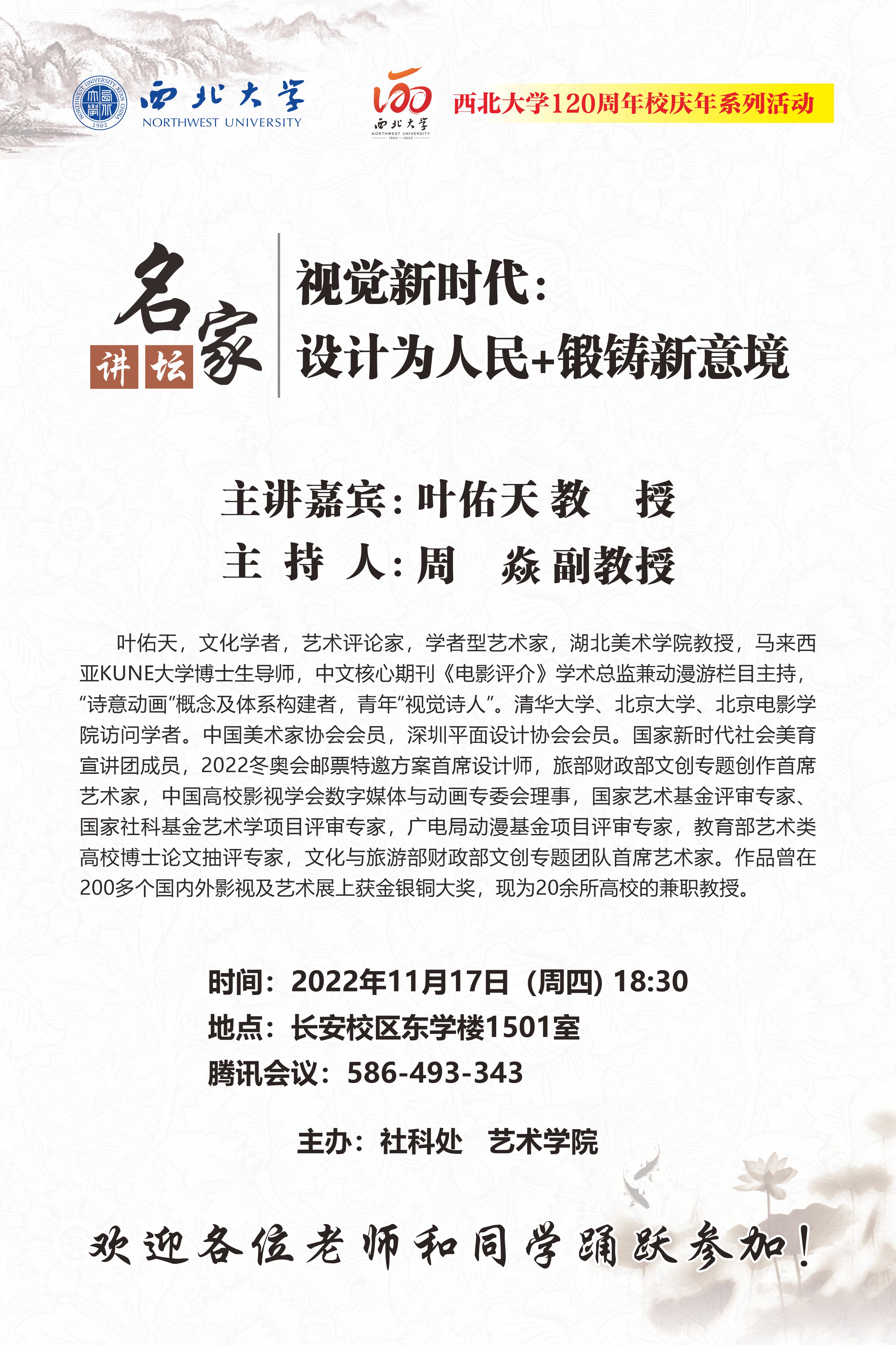 叶佑天 教授 BB(中国)120周年校庆年系列活动:视觉新时代:设计为人民+锻铸新意境 讲座时间 2022年11月17日(周四)18:30 讲座地点 腾讯会议:586493343 讲座人介绍 叶佑天 教授 讲座内容