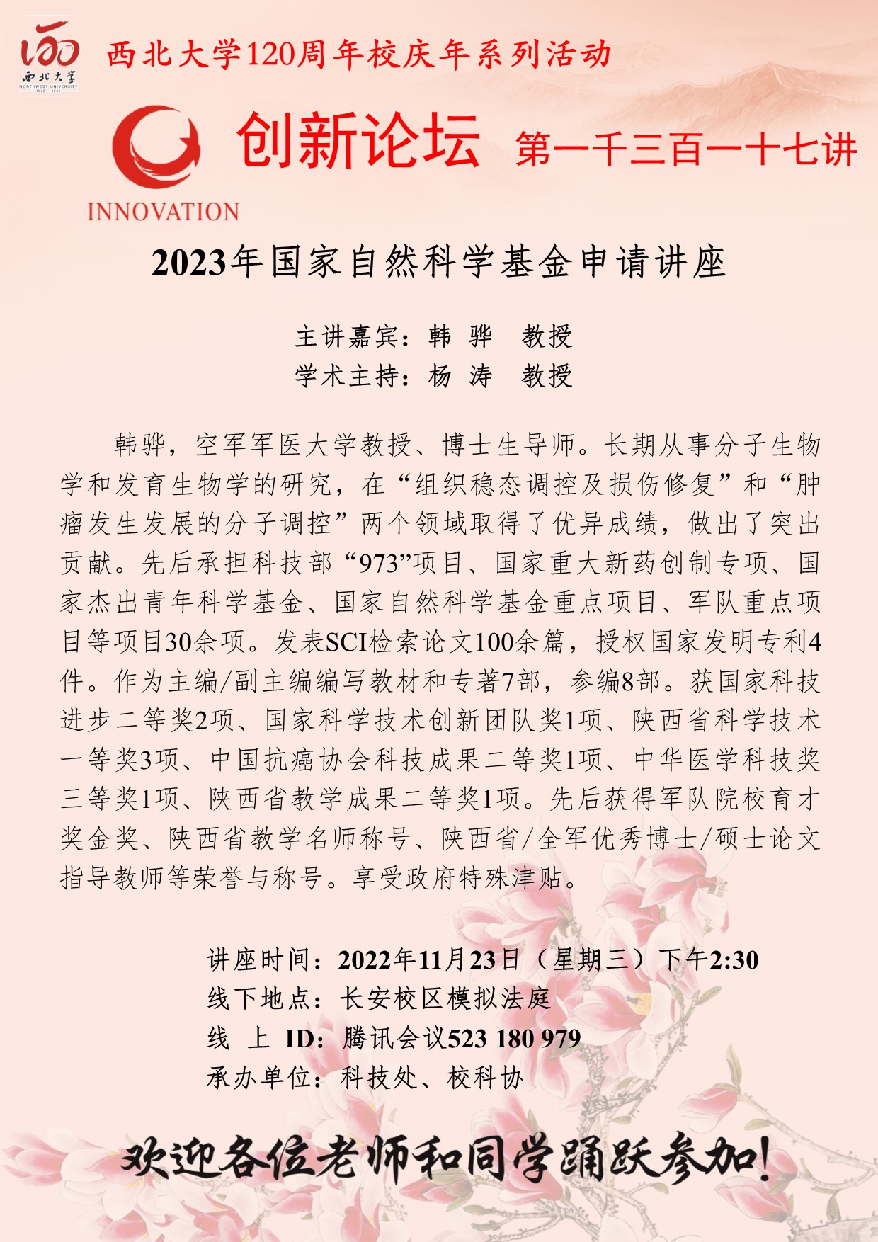 韩骅 教授 BB平台创新论坛第一千三百一十七讲暨120周年校庆年系列活动:2023年国家自然科学基金申请讲座 讲座时间 2022年11月23日(星期三)下午2:30 讲座地点 长安校区模拟法庭 讲座人介绍 韩骅 教授 讲座内容