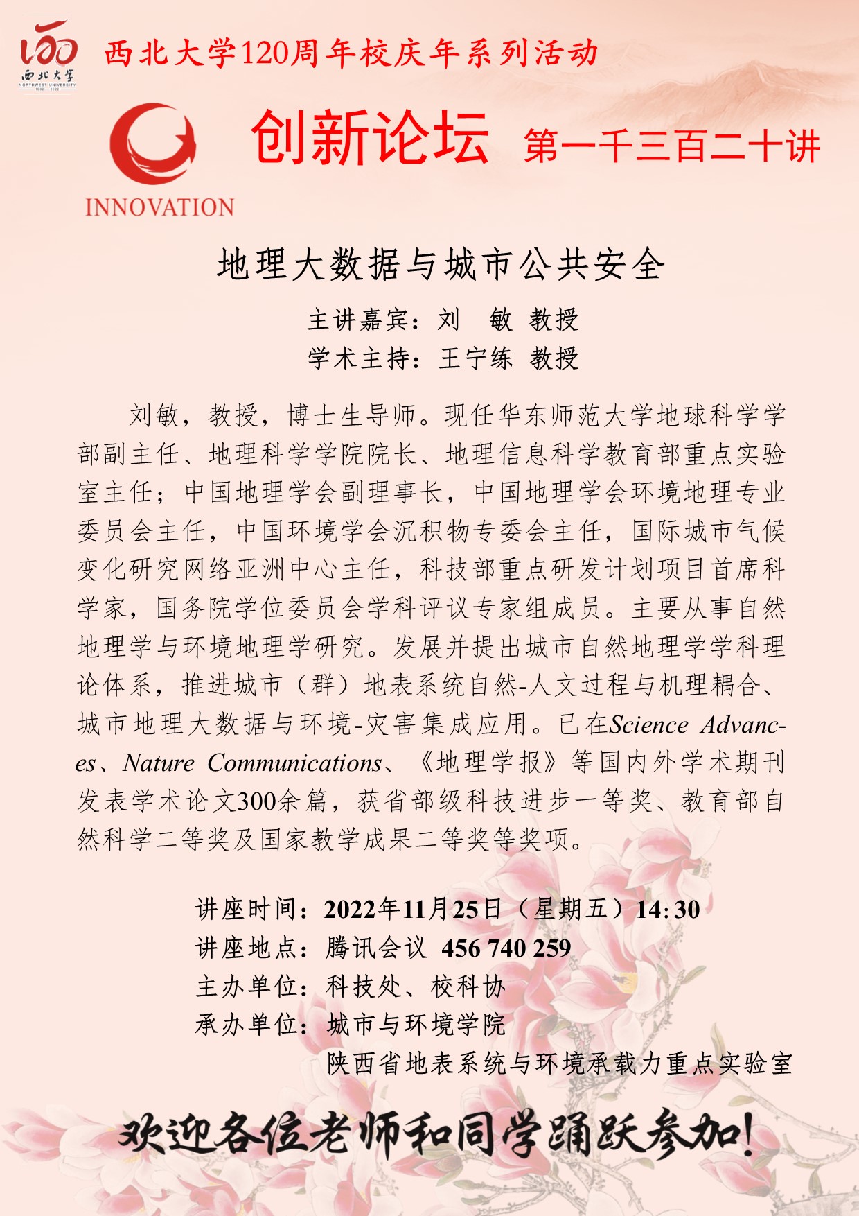 刘敏 教授 BB平台创新论坛第一千三百二十讲暨120周年校庆年系列活动: 地理大数据与城市公共安全 讲座时间 2022年11月25日(星期五)14:30 讲座地点 腾讯会议 456 740 259 讲座人介绍 刘敏 教授 讲座内容