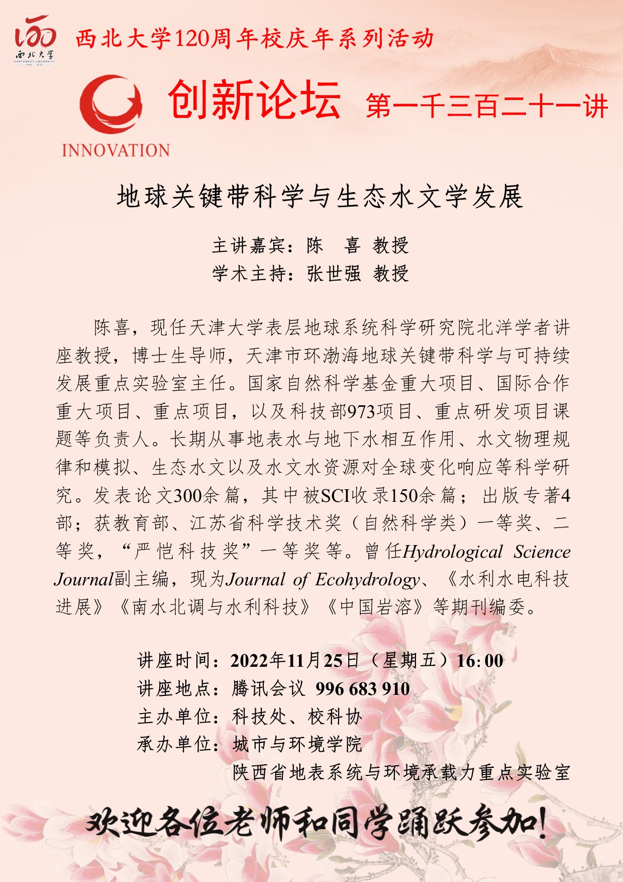 陈喜 教授 BB平台创新论坛第一千三百二十一讲暨120周年校庆年系列活动:地球关键带科学与生态水文学发展 讲座时间 2022年11月25日(星期五)16:00 讲座地点 腾讯会议 996 683 910 讲座人介绍 陈喜 教授 讲座内容