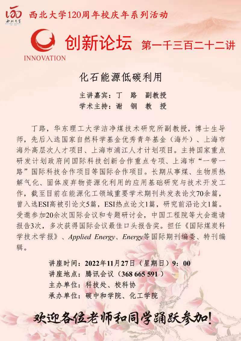 丁路 副教授 BB平台创新论坛第一千三百二十二讲暨120周年校庆年系列活动: 化石能源低碳利用 讲座时间 2022年11月27日(星期日) 9:00 讲座地点 腾讯会议368 665 591 讲座人介绍 丁路 副教授 讲座内容