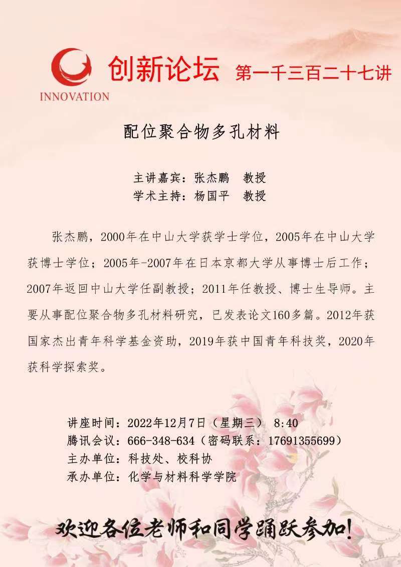 BB平台创新论坛第一千三百二十七讲:配位聚合物多孔材料