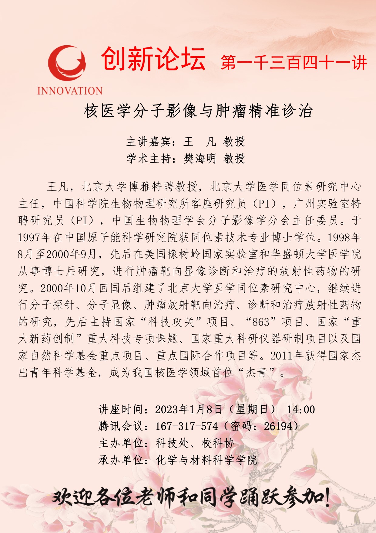 王凡 教授 BB平台创新论坛第一千三百四十一讲:核医学分子影像与肿瘤精准诊治 讲座时间 2023年1月8日(星期日) 14:00 讲座地点 腾讯会议:167-317-574 讲座人介绍 王凡 教授 讲座内容