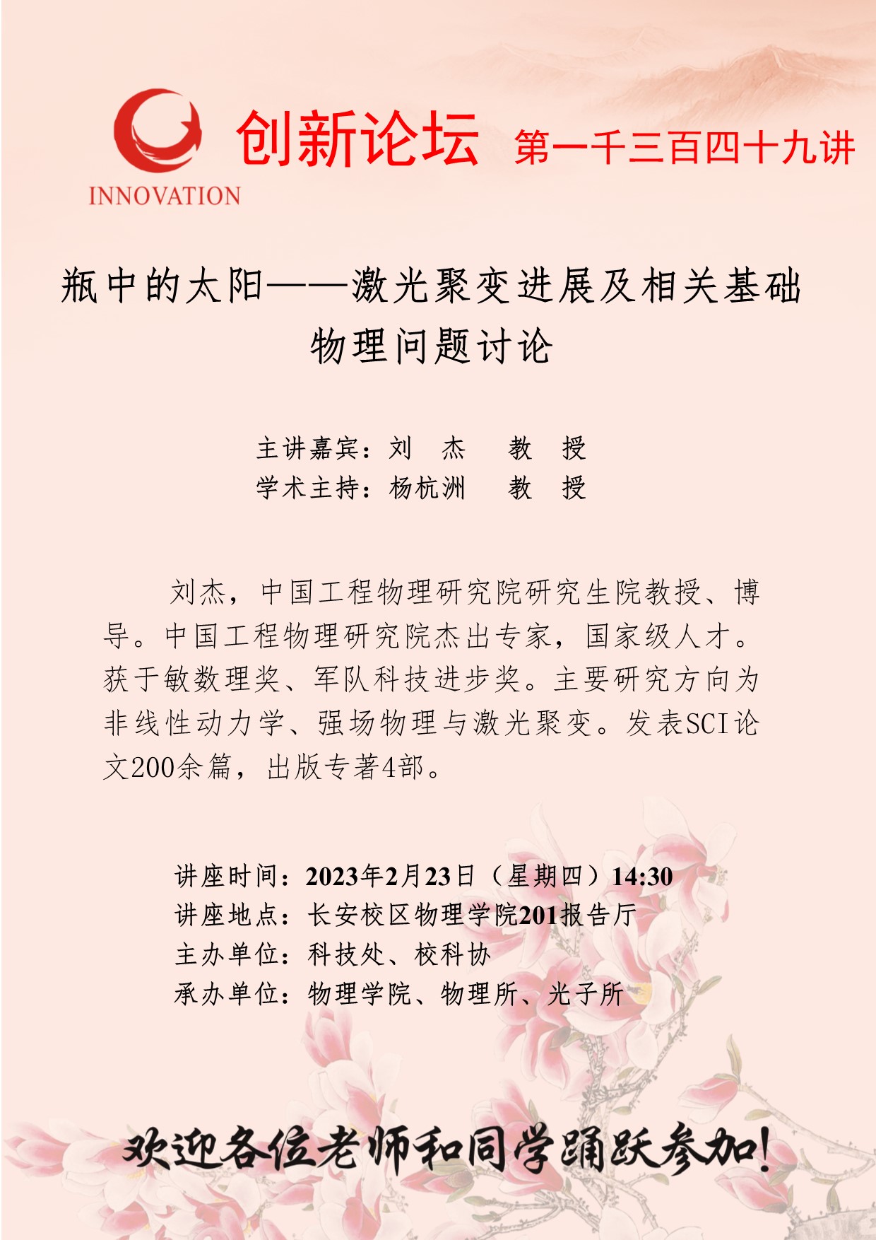 刘杰 教授 BB平台创新论坛第一千三百四十九讲:瓶中的太阳——激光聚变进展及相关基础物理问题讨论 讲座时间 2023年2月23日(星期四)14:30 讲座地点 长安校区物理学院201报告厅 讲座人介绍 刘杰 教授 讲座内容