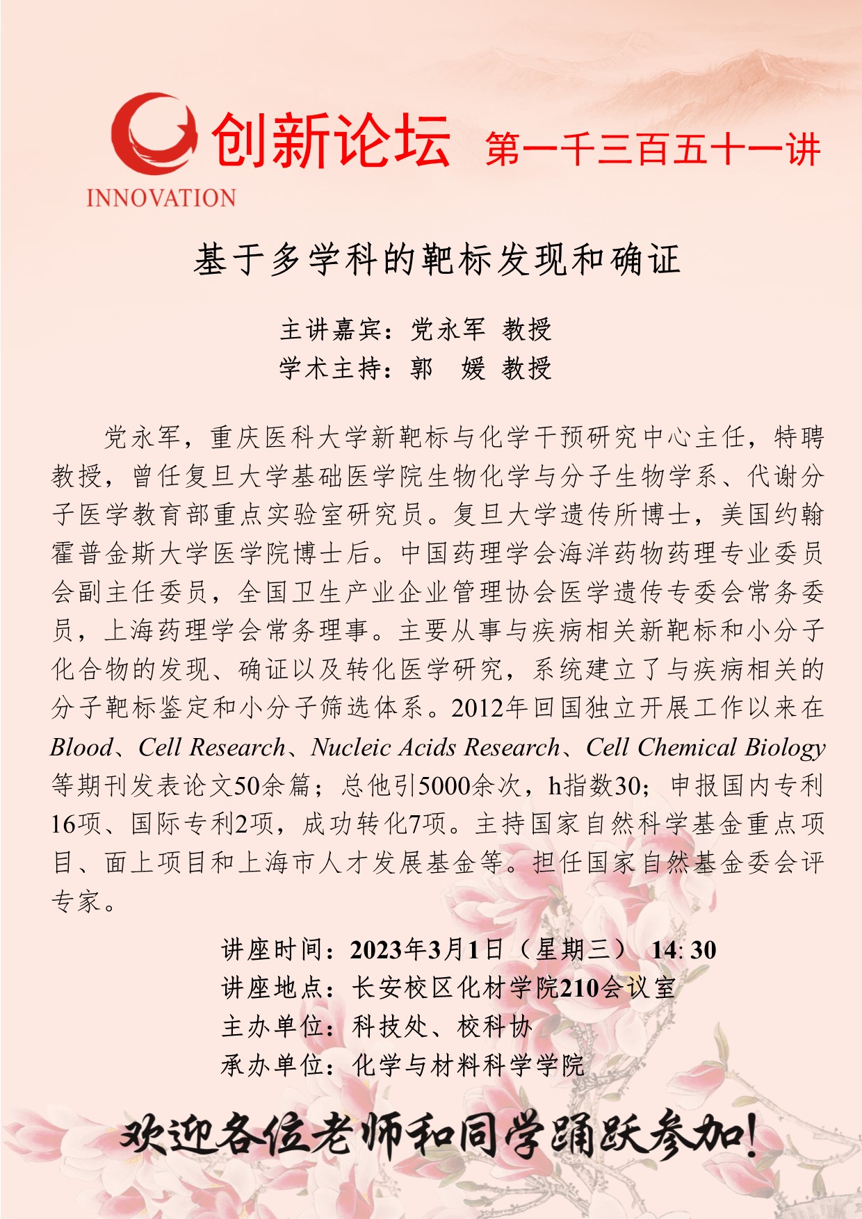 党永军 教授 BB平台创新论坛第一千三百五十一讲:基于多学科的靶标发现和确证 讲座时间 2023年3月1日(星期三) 14: 30 讲座地点 长安校区化材学院210会议室 讲座人介绍 党永军 教授 讲座内容