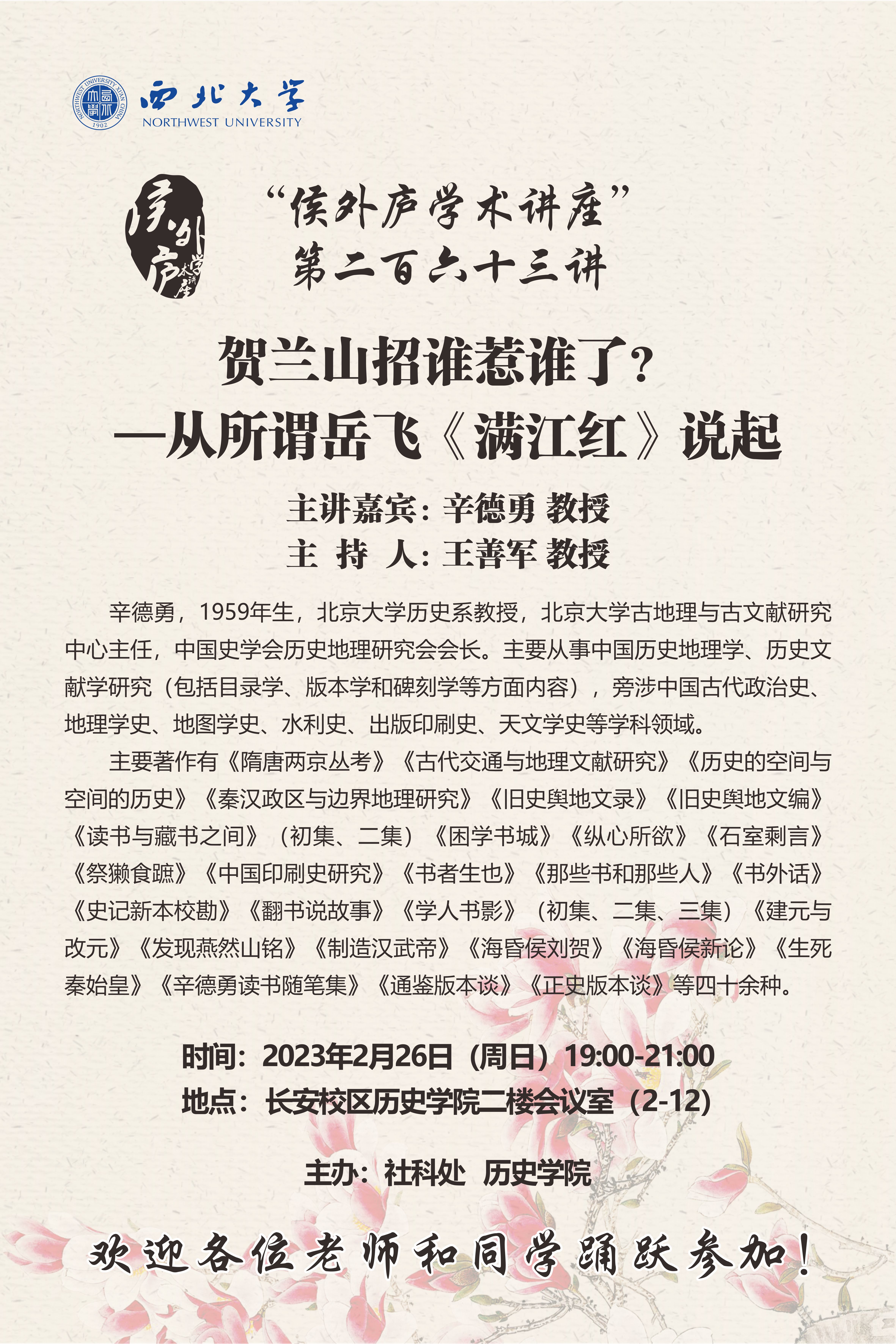 辛德勇 教授 侯外庐学术讲座第二百六十三讲:贺兰山招谁惹谁了?——从所谓岳飞《满江红》说起 讲座时间 2023年2月26日(周日)19:00-21:00 讲座地点 长安校区历史学院二楼会议室(2-12) 讲座人介绍 辛德勇 教授 讲座内容