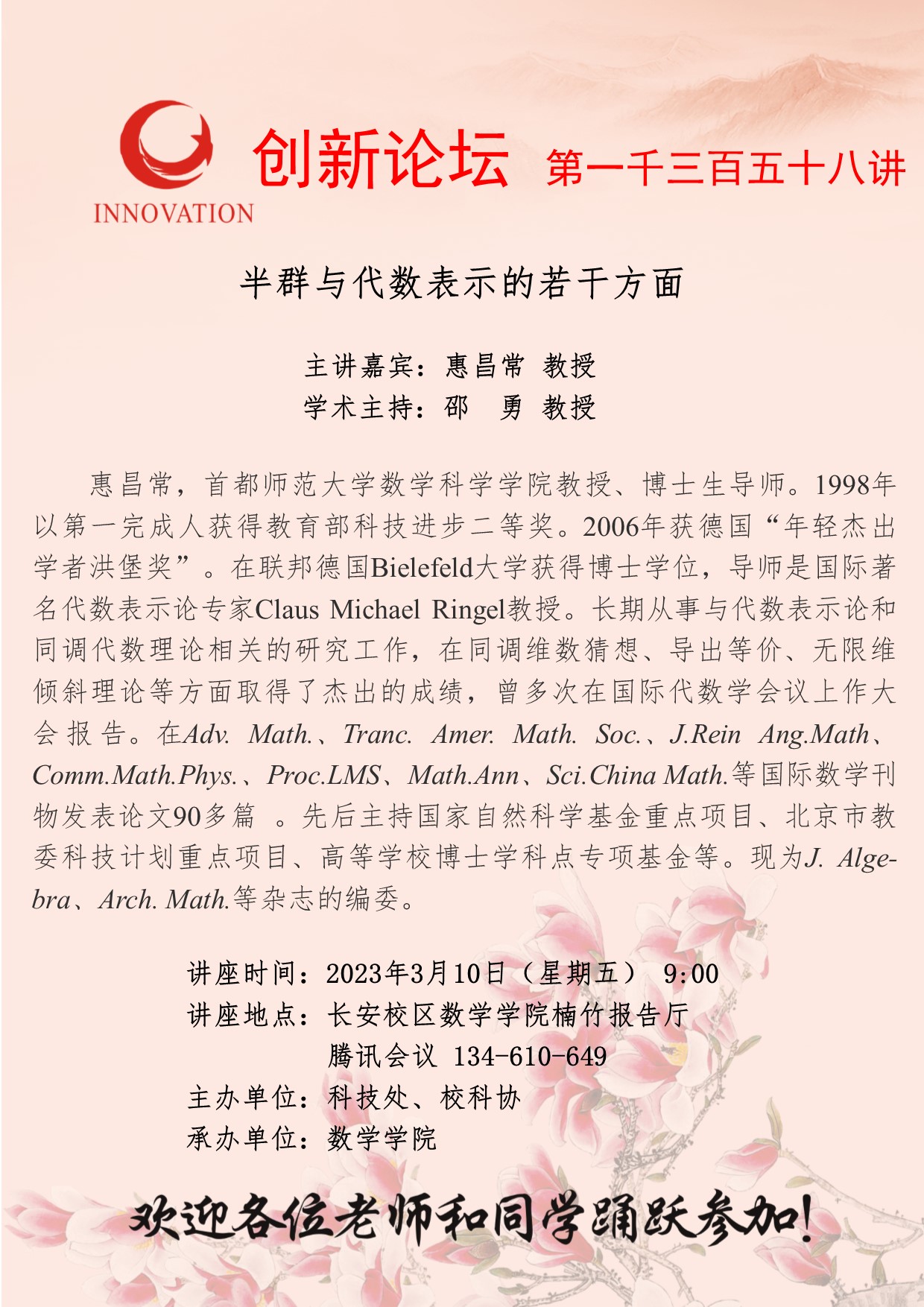 惠昌常 教授 BB平台创新论坛第一千三百五十八讲:半群与代数表示的若干方面 讲座时间 2023年3月10日(星期五) 9:00 讲座地点 长安校区数学学院楠竹报告厅、腾讯会议134-610-649 讲座人介绍 惠昌常 教授 讲座内容