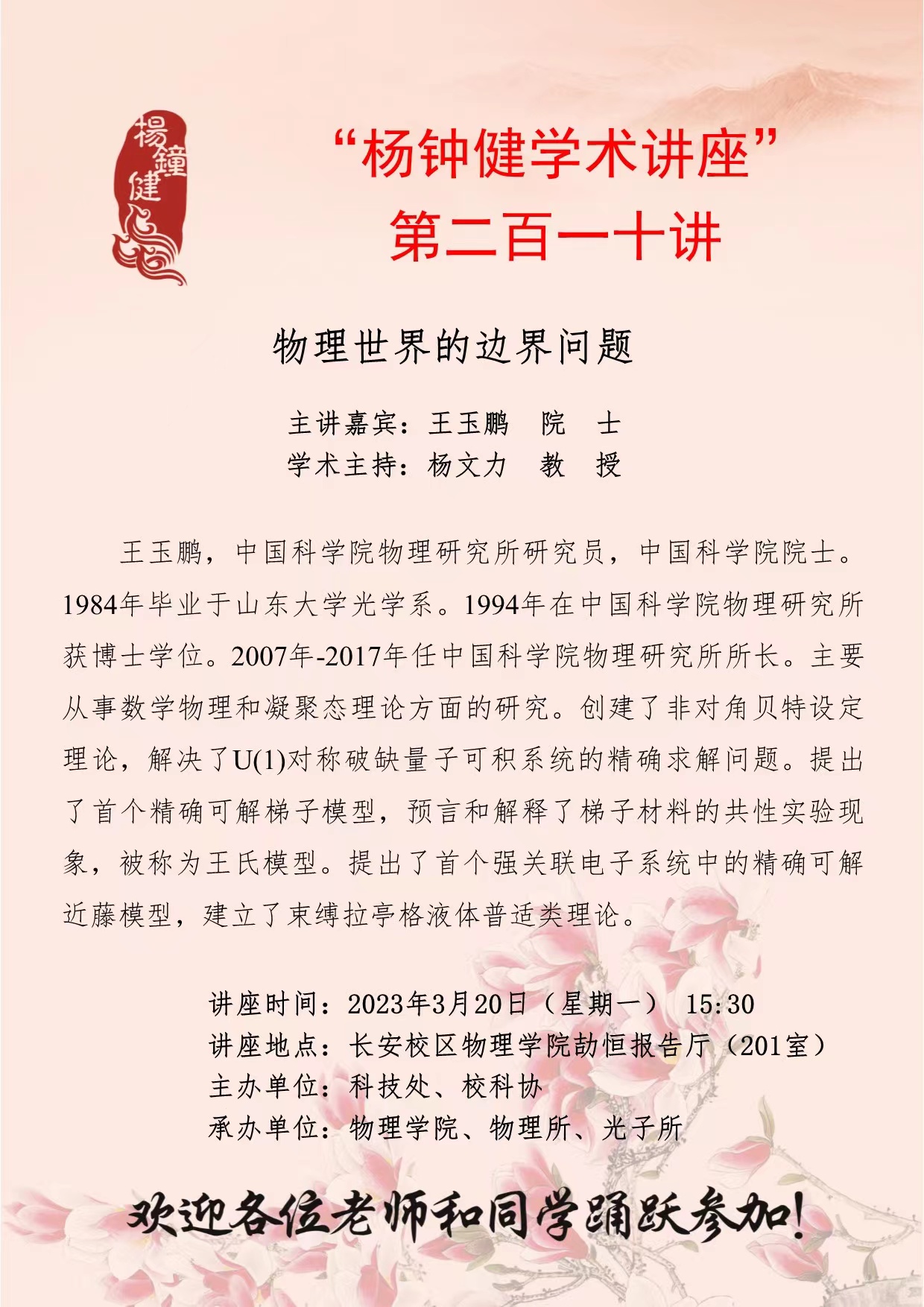 王玉鹏 院士 “杨钟健学术讲座”第二百一十讲:物理世界的边界问题 讲座时间 2023年3月20日(星期一) 15:30 讲座地点 长安校区物理学院劼恒报告厅(201室) 讲座人介绍 王玉鹏 院士 讲座内容