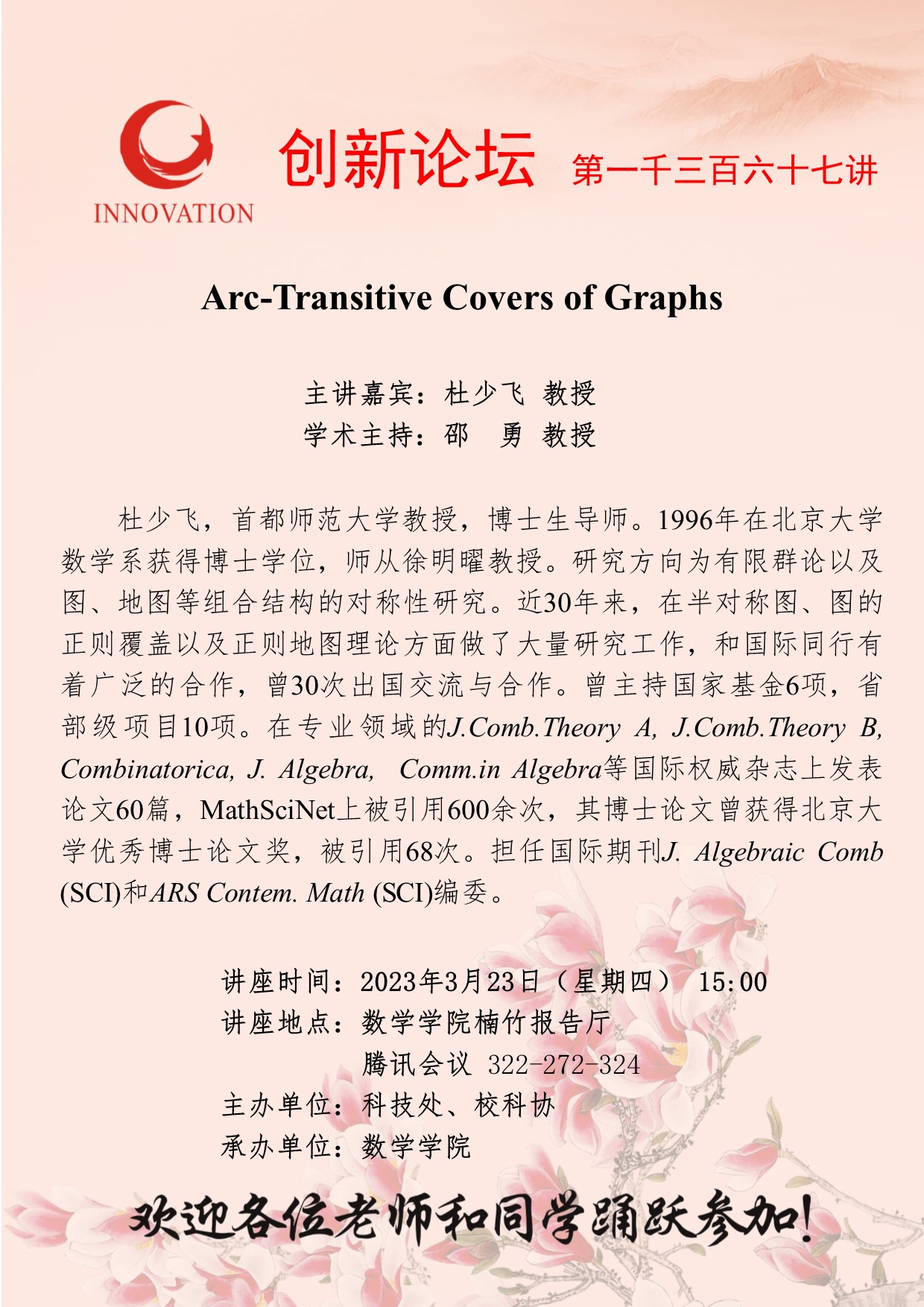 杜少飞 教授 BB平台创新论坛第一千三百六十七讲:Arc-Transitive Covers of Graphs 讲座时间 2023年3月23日(星期四) 15:00 讲座地点 数学学院楠竹报告厅、腾讯会议 322-272-324 讲座人介绍 杜少飞 教授 讲座内容