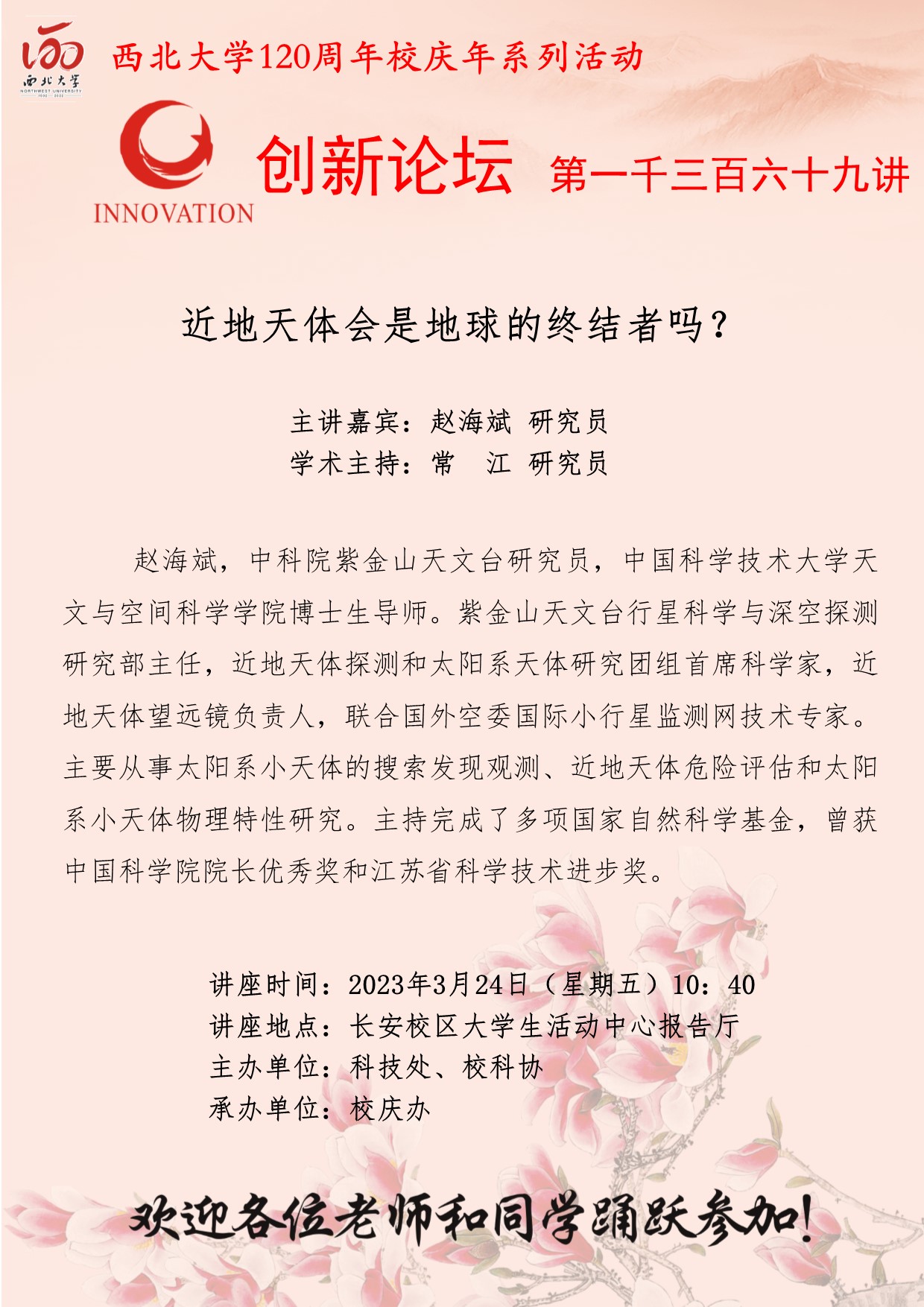 赵海斌 研究员 BB平台创新论坛第一千三百六十九讲暨120周年校庆年系列活动:近地天体会是地球的终结者吗? 讲座时间 2023年3月24日(星期五)10:40 讲座地点 长安校区大学生活动中心报告厅 讲座人介绍 赵海斌 研究员 讲座内容