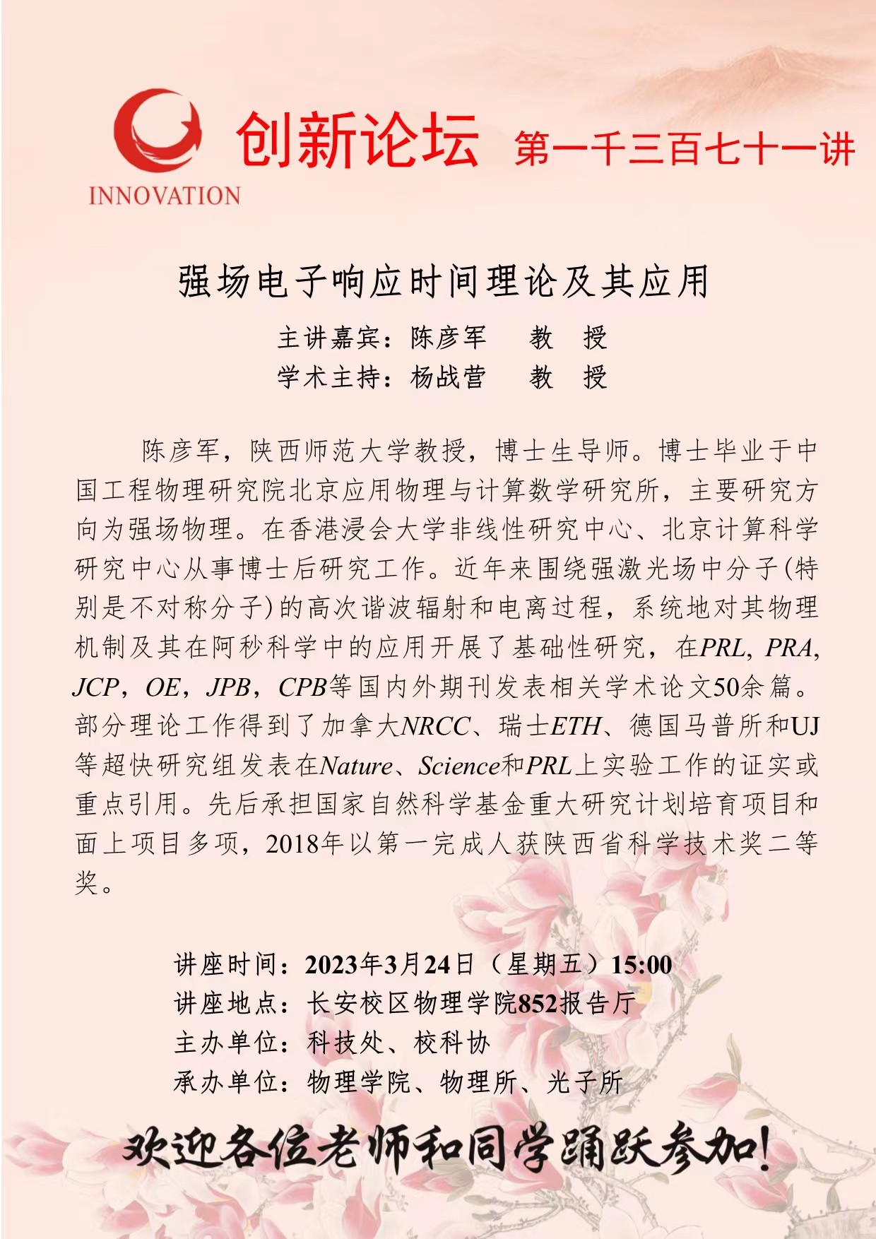 陈彦军 教 授 BB平台创新论坛第一千三百七十一讲:强场电子响应时间理论及其应用 讲座时间 2023年3月24日(星期五)15:00 讲座地点 长安校区物理学院852报告厅 讲座人介绍 陈彦军 教 授 讲座内容