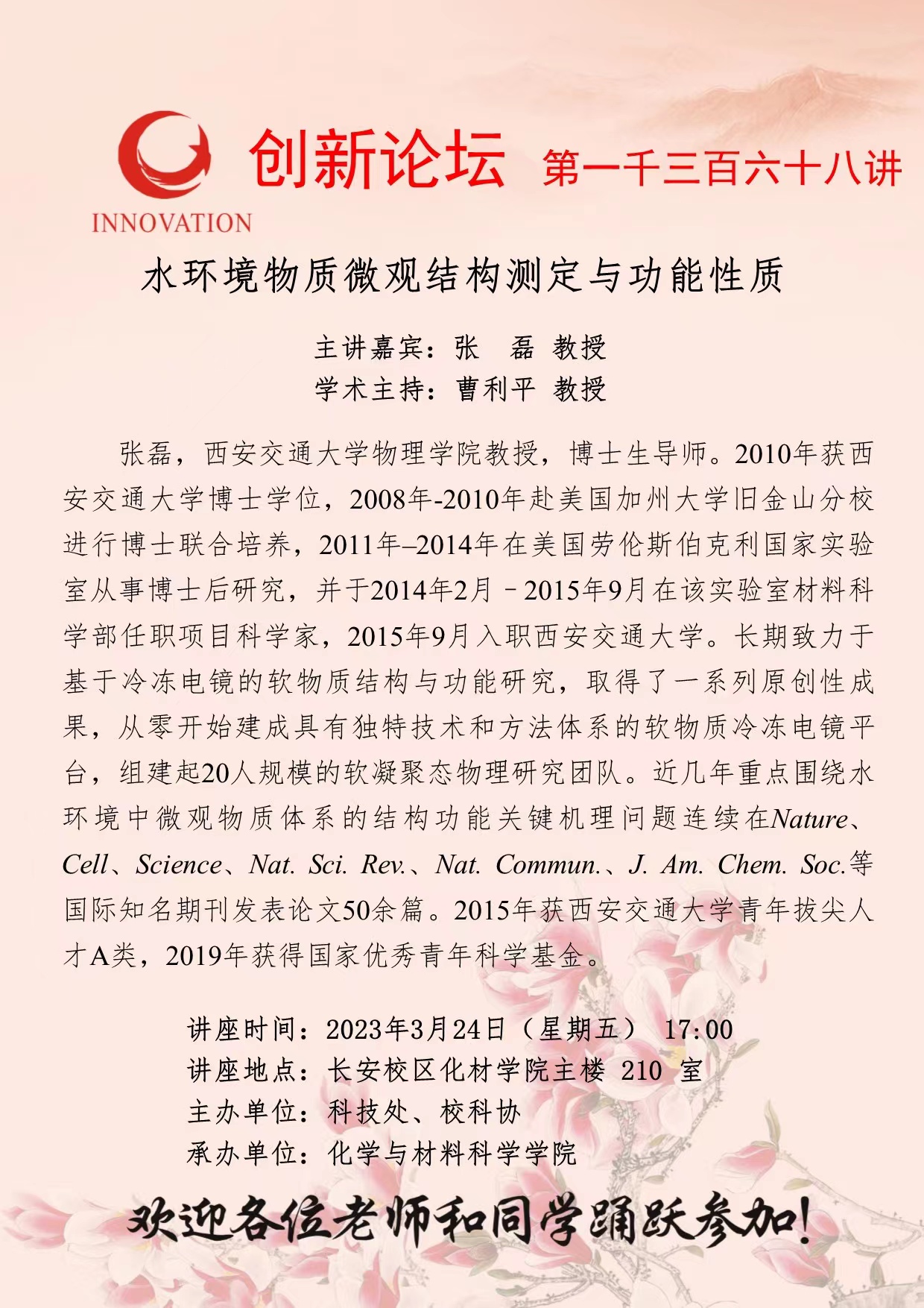 张磊 教授 BB平台创新论坛第一千三百六十八讲:水环境物质微观结构测定与功能性质机理 讲座时间 2023年3月24日(星期五) 17:00 讲座地点 长安校区化材学院主楼 210 室 讲座人介绍 张磊 教授 讲座内容