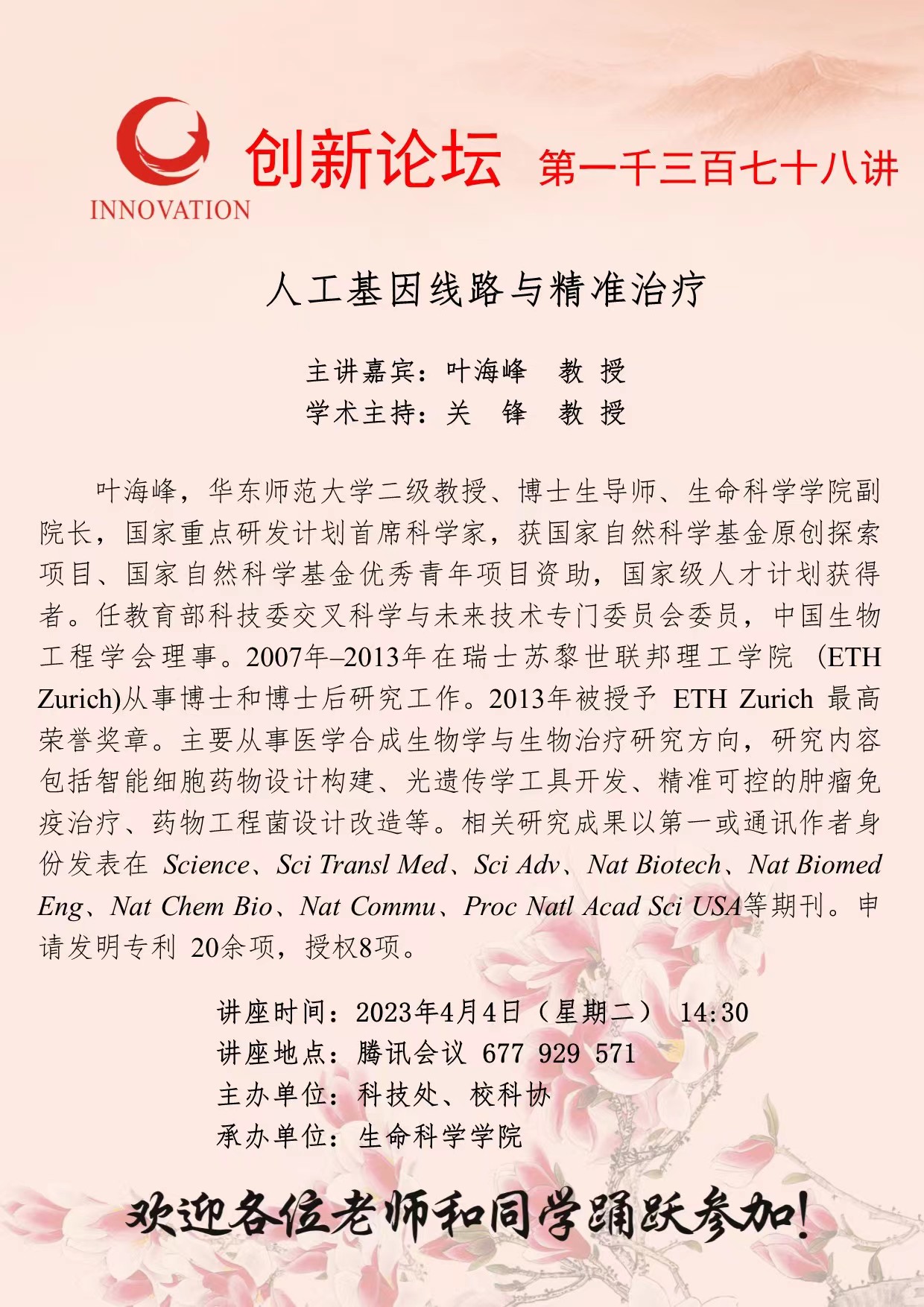 叶海峰 教授 BB平台创新论坛第一千三百七十八讲:人工基因线路与精准治疗 讲座时间 2023年4月4日(星期二) 14:30 讲座地点 腾讯会议 677 929 571 讲座人介绍 叶海峰 教授 讲座内容