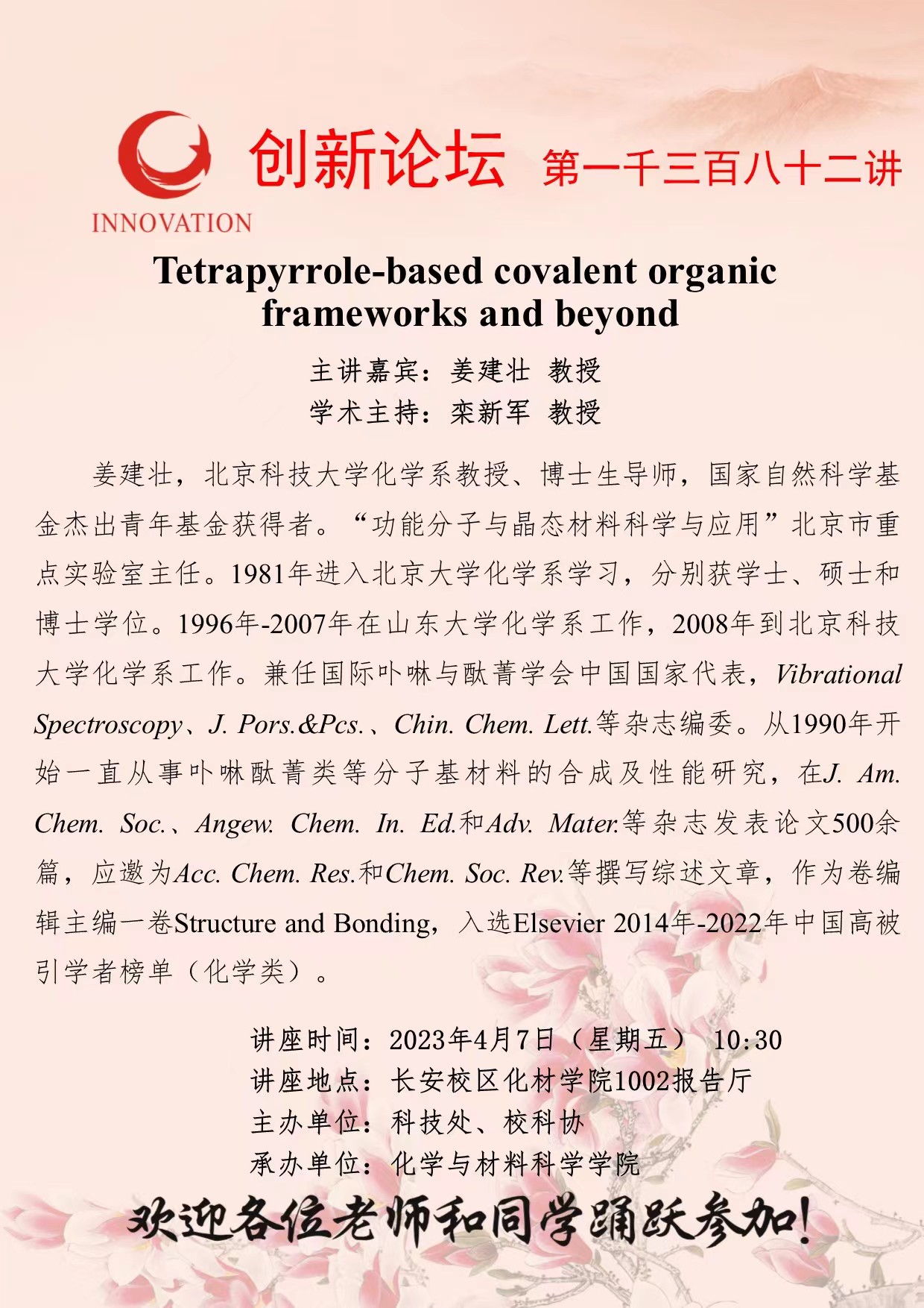姜建壮 教 授 BB平台创新论坛第一千三百八十二讲:Tetrapyrrole-based covalent organic frameworks and beyond 讲座时间 2023年4月7日(星期五) 10:30 讲座地点 长安校区化材学院1002报告厅 讲座人介绍 姜建壮 教 授 讲座内容