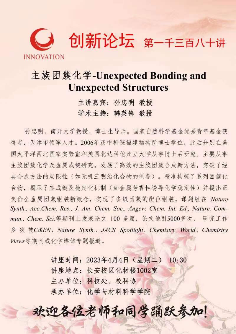 孙忠明 教授 BB平台创新论坛第一千三百八十讲:主族团簇化学-Unexpected Bonding and Unexpected Structures 讲座时间 2023年4月4日(星期二) 10:30 讲座地点 长安校区化材楼1002室 讲座人介绍 孙忠明 教授 讲座内容