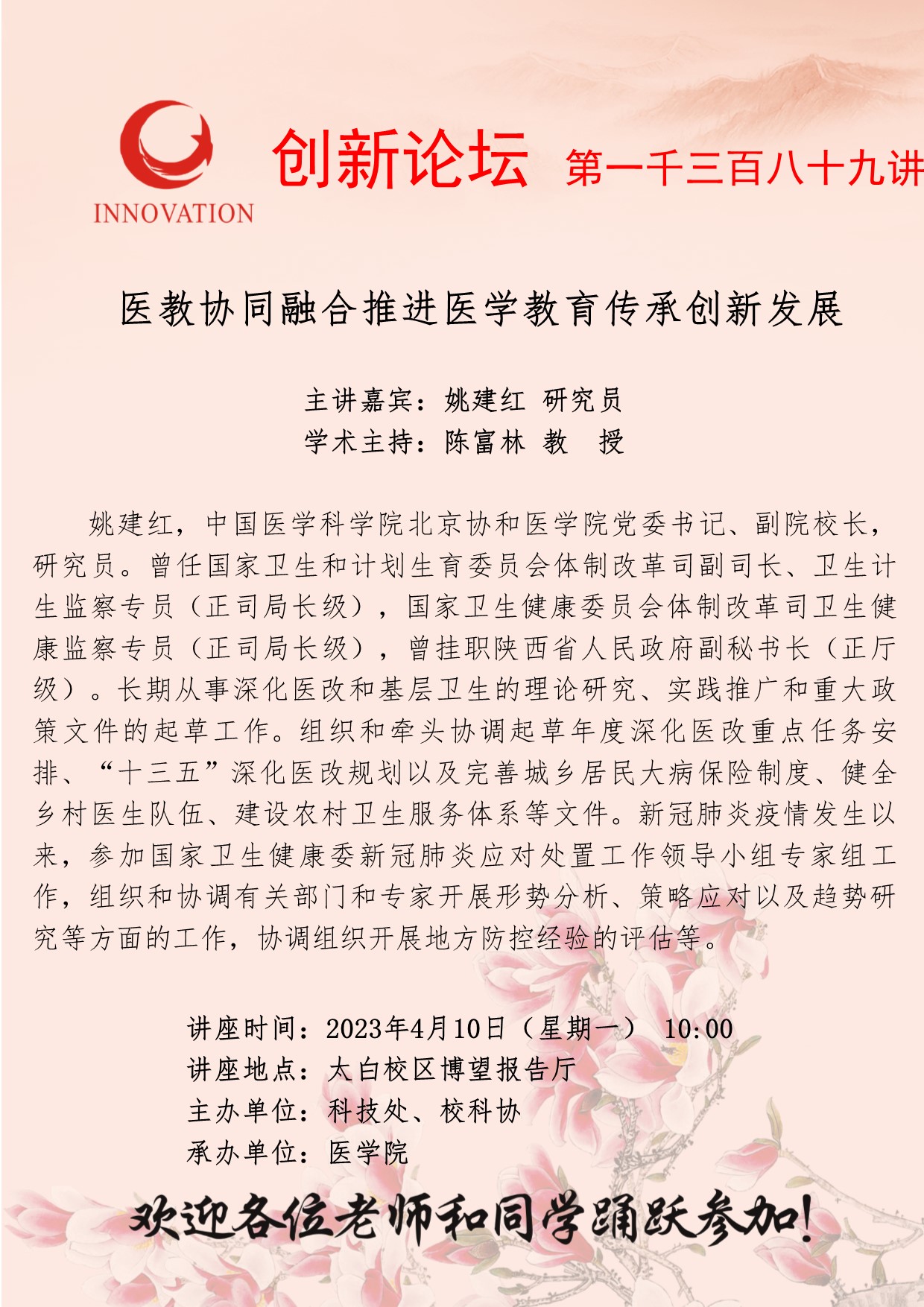 姚建红 研究员 BB平台创新论坛第一千三百八十九讲:医教协同融合推进医学教育传承创新发展 讲座时间 2023年4月10日(星期一) 10:00 讲座地点 太白校区博望报告厅 讲座人介绍 姚建红 研究员 讲座内容