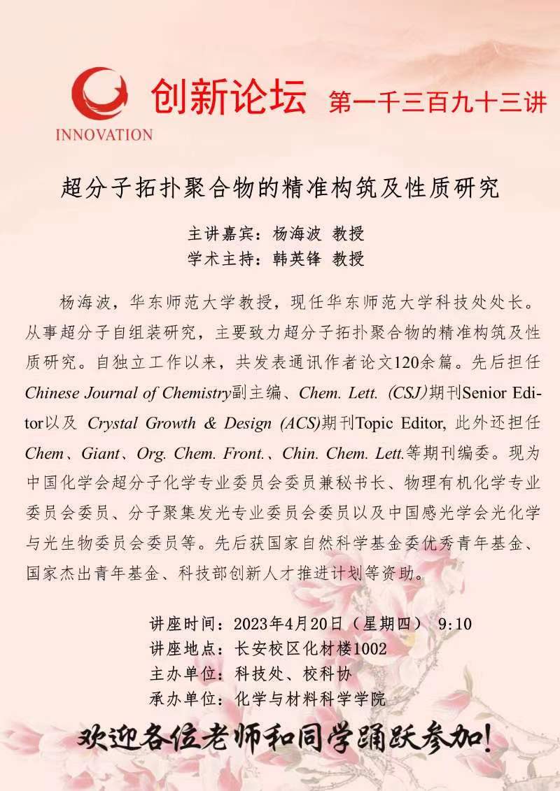 杨海波 教授 BB平台创新论坛第一千三百九十三讲:超分子拓扑聚合物的精准构筑及性质研究 讲座时间 2023年4月20日(星期四) 9:10 讲座地点 长安校区化材楼1002 讲座人介绍 杨海波 教授 讲座内容