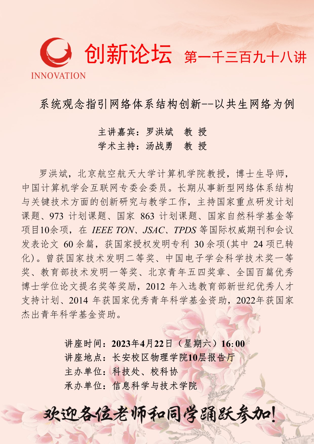罗洪斌 教 授 BB平台创新论坛第一千三百九十八讲:系统观念指引网络体系结构创新--以共生网络为例 讲座时间 2023年4月22日(星期六)16:00 讲座地点 长安校区物理学院10层报告厅 讲座人介绍 罗洪斌 教 授 讲座内容