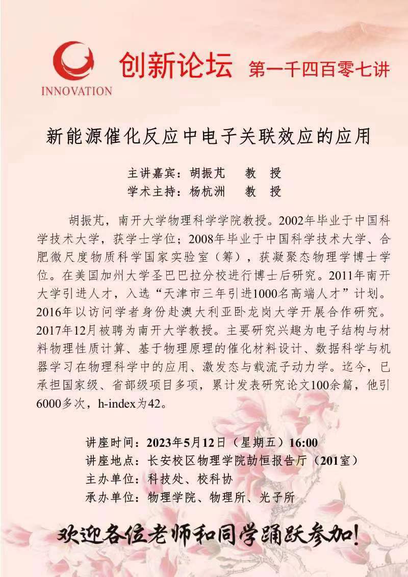 胡振芃 教 授 BB平台创新论坛第一千四百零七讲:新能源催化反应中电子关联效应的应用 讲座时间 2023年5月12日(星期五)16:00 讲座地点 长安校区物理学院劼恒报告厅(201室) 讲座人介绍 胡振芃 教 授 讲座内容