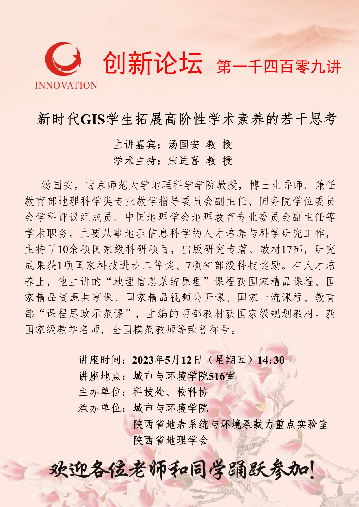 汤国安 教授 BB平台创新论坛第一千四百零九讲:新时代GIS学生拓展高阶性学术素养的若干思考 讲座时间 2023年5月12日(星期五)14:30 讲座地点 城市与环境学院516室 讲座人介绍 汤国安 教授 讲座内容
