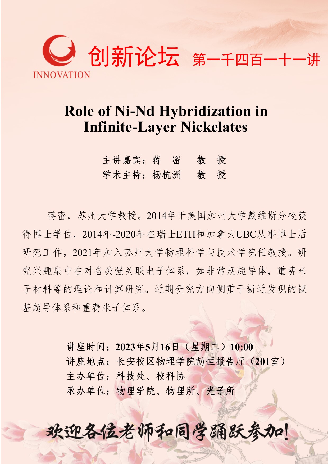 蒋密 教授 BB平台创新论坛第一千四百一十一讲:Role of Ni-Nd Hybridization in Infinite-Layer Nickelates 讲座时间 2023年5月16日(星期二)10:00 讲座地点 长安校区物理学院劼恒报告厅(201室) 讲座人介绍 蒋密 教授 讲座内容