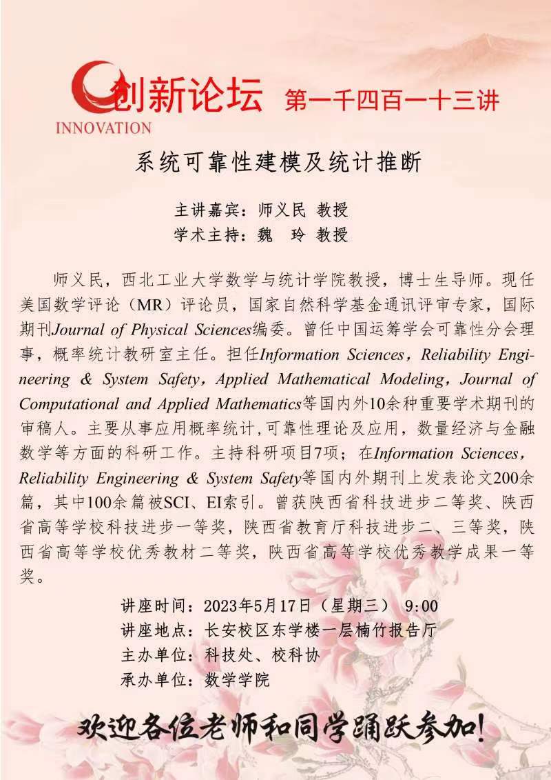 师义民 教授 BB平台创新论坛第一千四百一十三讲:系统可靠性建模及统计推断 讲座时间 2023年5月17日(星期三) 9:00 讲座地点 长安校区东学楼一层楠竹报告厅 讲座人介绍 师义民 教授 讲座内容