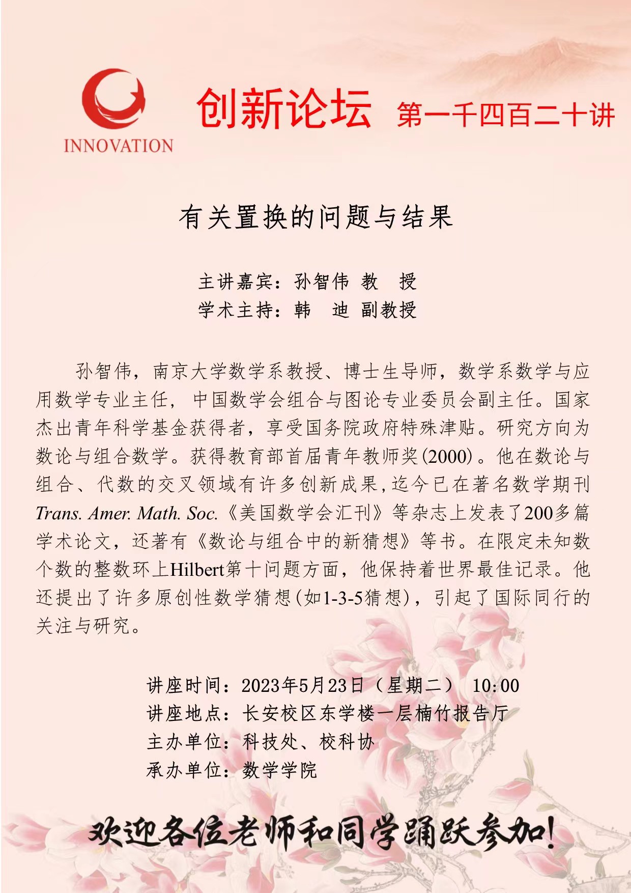 孙智伟 教 授 BB平台创新论坛第一千四百二十讲:有关置换的问题与结果 讲座时间 2023年5月23日(星期二) 10:00 讲座地点 长安校区东学楼一层楠竹报告厅 讲座人介绍 孙智伟 教 授 讲座内容