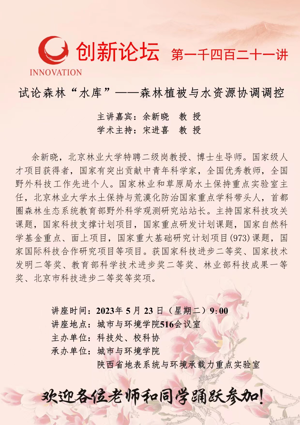 余新晓 教 授 BB平台创新论坛第一千四百二十一讲:试论森林“水库”——森林植被与水资源协调调控 讲座时间 2023年5月23日(星期二)9:00 讲座地点 城市与环境学院516会议室 讲座人介绍 余新晓 教 授 讲座内容