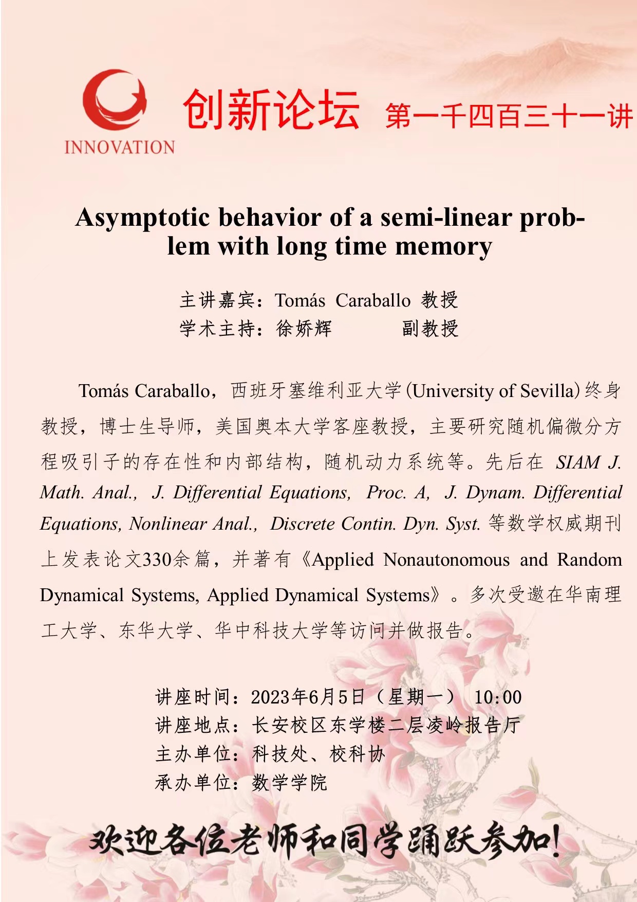 Tomás Caraballo 教授 BB平台创新论坛第一千四百三十一讲:Asymptotic behavior of a semi-linear problem with long time memory 讲座时间 2023年6月5日(星期一) 10:00 讲座地点 长安校区东学楼二层凌岭报告厅 讲座人介绍 Tomás Caraballo 教授 讲座内容