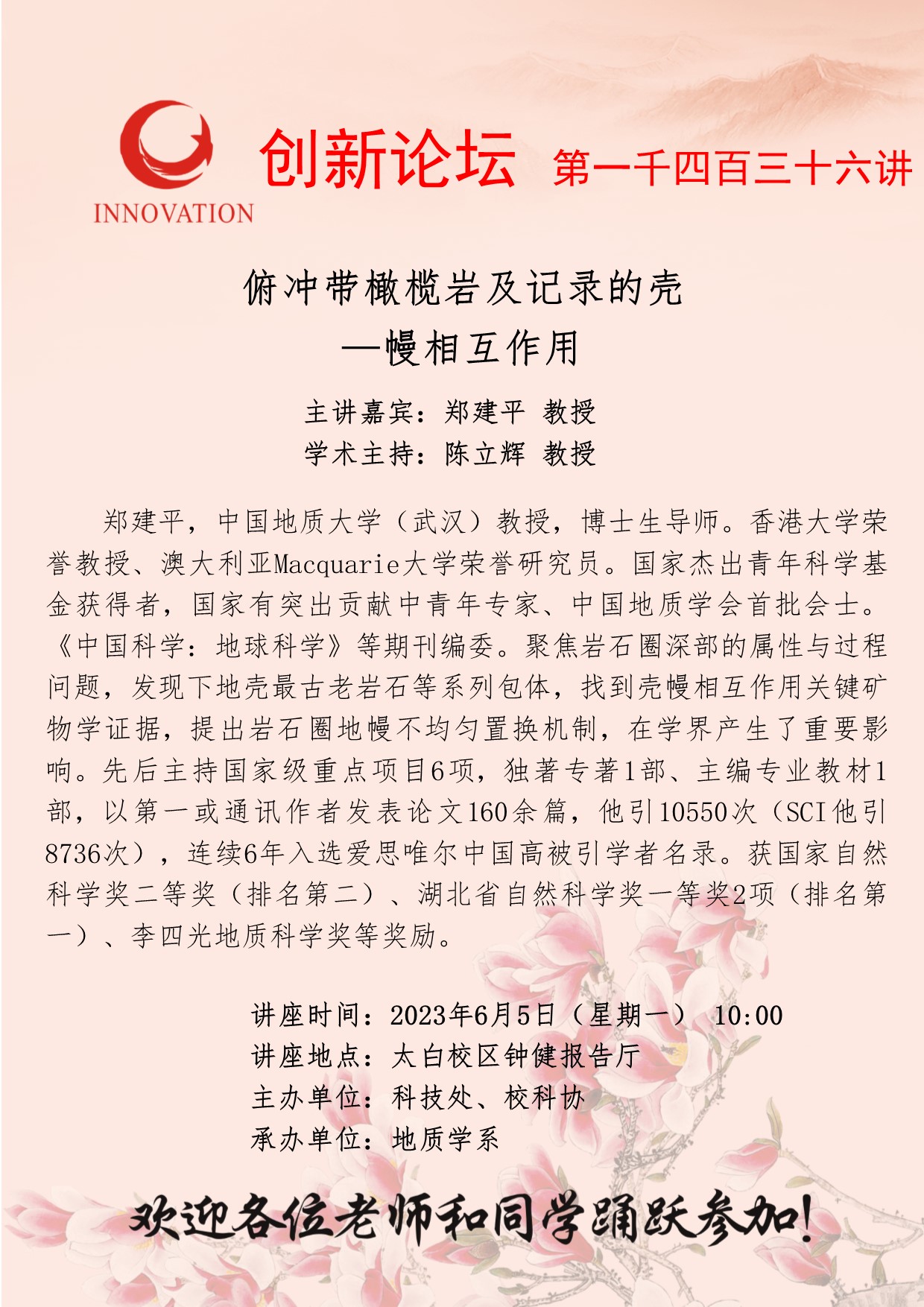 郑建平 教授 BB平台创新论坛第一千四百三十六讲:俯冲带橄榄岩及记录的壳—幔相互作用 讲座时间 2023年6月5日(星期一) 10:00 讲座地点 太白校区钟健报告厅 讲座人介绍 郑建平 教授 讲座内容