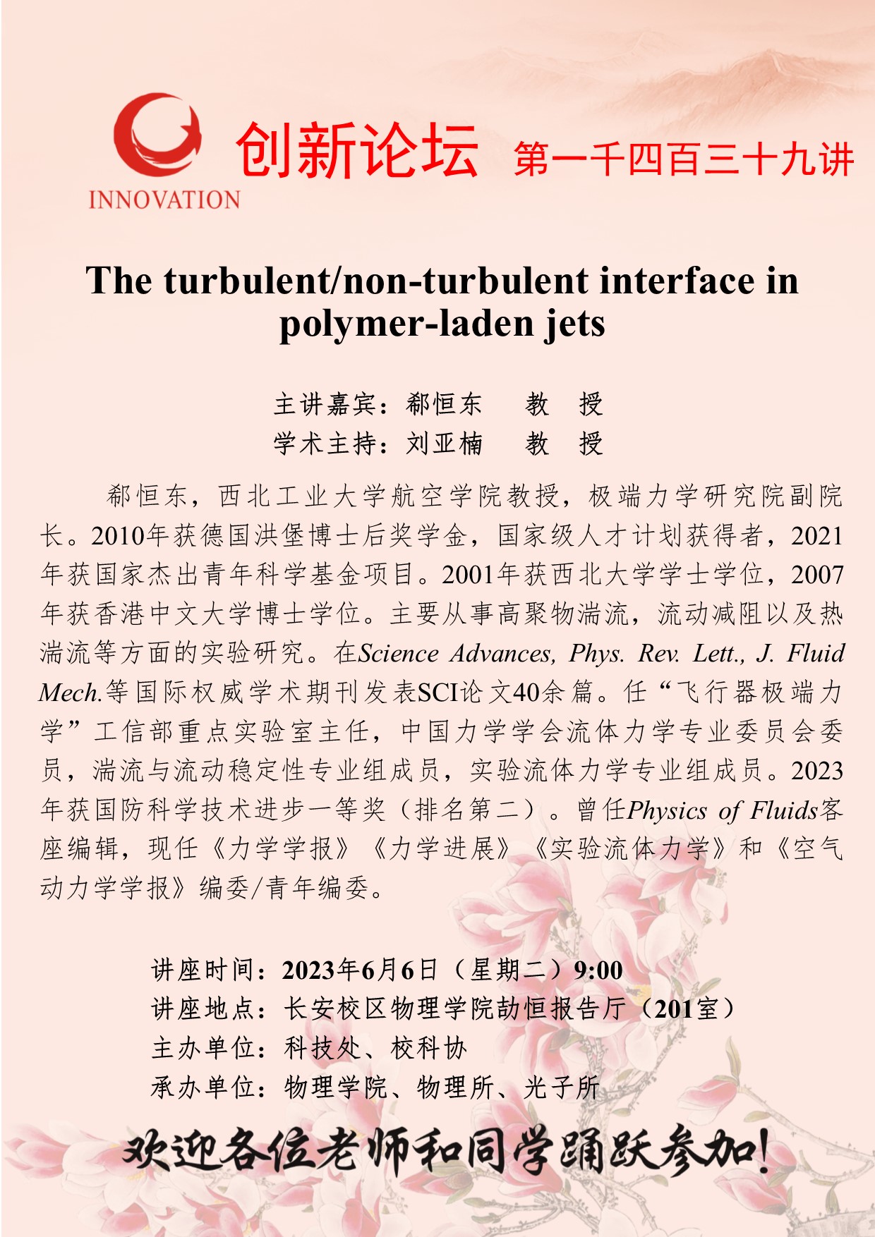 郗恒东 教授 BB平台创新论坛第一千四百三十九讲:The turbulent/non-turbulent interface in polymer-laden jets 讲座时间 2023年6月6日(星期二)9:00 讲座地点 长安校区物理学院劼恒报告厅(201室) 讲座人介绍 郗恒东 教授 讲座内容