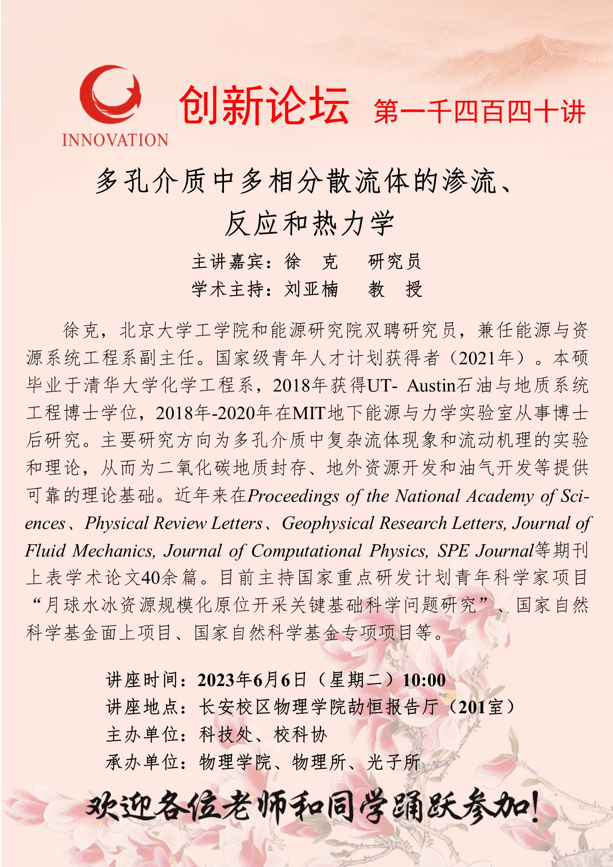 徐克 研究员 BB平台创新论坛第一千四百四十讲:多孔介质中多相分散流体的渗流、反应和热力学 讲座时间 2023年6月6日(星期二)10:00 讲座地点 长安校区物理学院劼恒报告厅(201室) 讲座人介绍 徐克 研究员 讲座内容