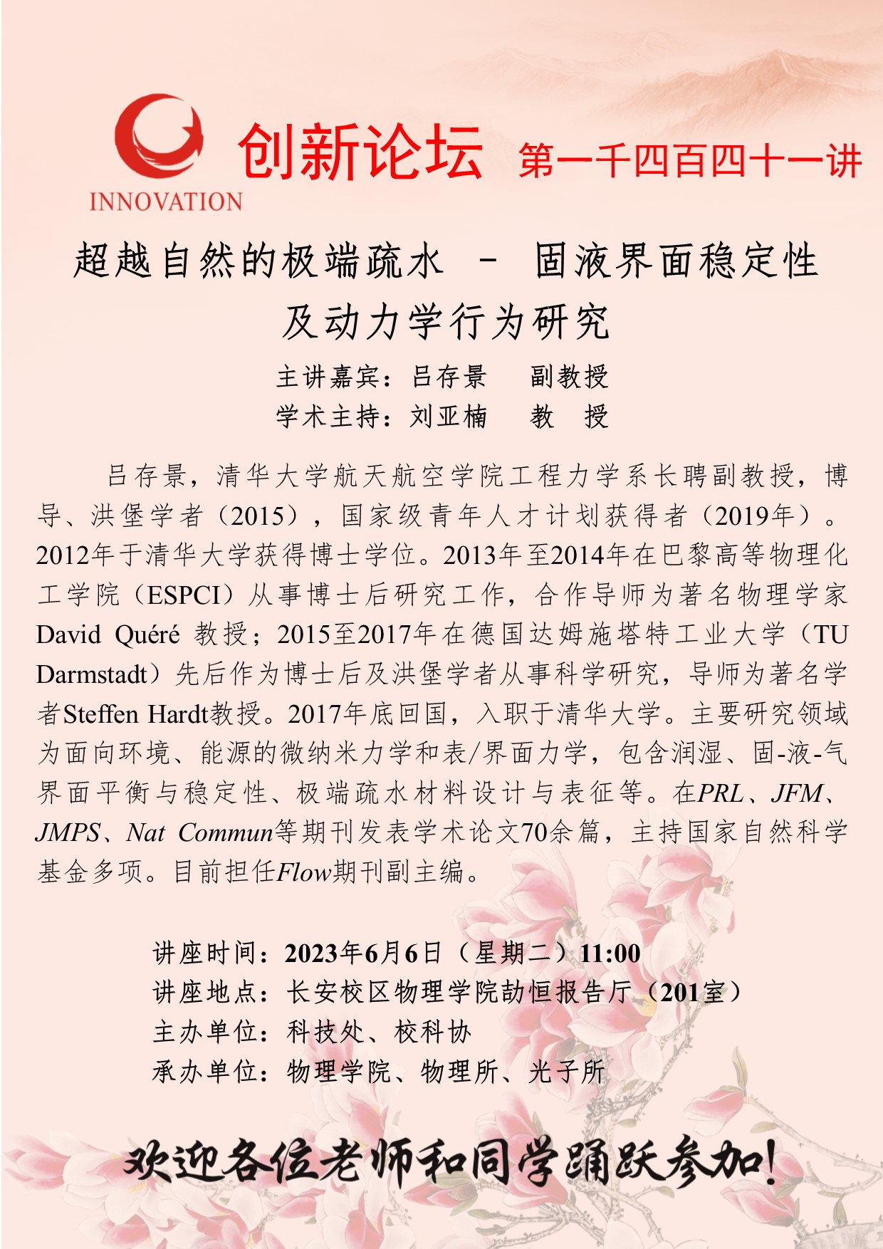 吕存景 副教授 BB平台创新论坛第一千四百四十一讲:超越自然的极端疏水 – 固液界面稳定性及动力学行为研究 讲座时间 2023年6月6日(星期二)11:00 讲座地点 长安校区物理学院劼恒报告厅(201室) 讲座人介绍 吕存景 副教授 讲座内容