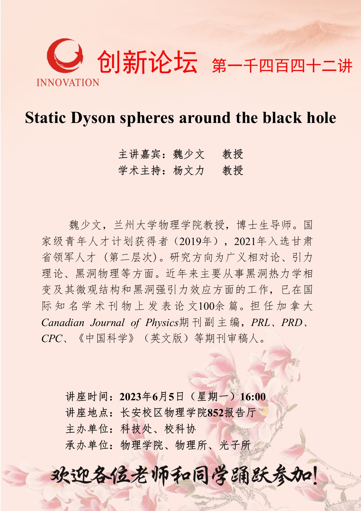 魏少文 教授 BB平台创新论坛第一千四百四十二讲:Static Dyson spheres around the black hole 讲座时间 2023年6月5日(星期一)16:00 讲座地点 长安校区物理学院852报告厅 讲座人介绍 魏少文 教授 讲座内容