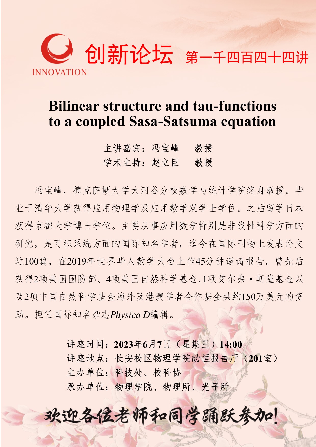 冯宝峰 教授 BB平台创新论坛第一千四百四十四讲:Bilinear structure and tau-functions to a coupled Sasa-Satsuma equation 讲座时间 2023年6月7日(星期三)14:00 讲座地点 长安校区物理学院劼恒报告厅(201室) 讲座人介绍 冯宝峰 教授 讲座内容
