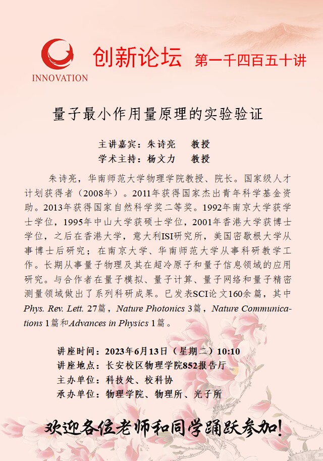 朱诗亮 教授 BB平台创新论坛第一千四百五十讲:量子最小作用量原理的实验验证 讲座时间 2023年6月13日(星期二)10:10 讲座地点 长安校区物理学院852报告厅 讲座人介绍 朱诗亮 教授 讲座内容
