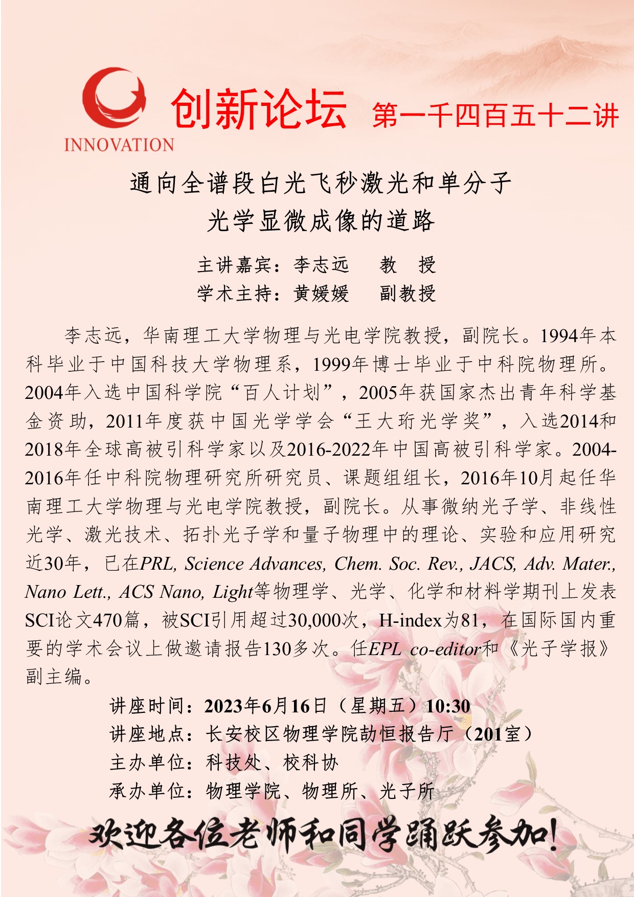 李志远 教授 BB平台创新论坛第一千四百五十二讲:通向全谱段白光飞秒激光和单分子光学显微成像的道路 讲座时间 2023年6月16日(星期五)10:30 讲座地点 长安校区物理学院劼恒报告厅(201室) 讲座人介绍 李志远 教授 讲座内容