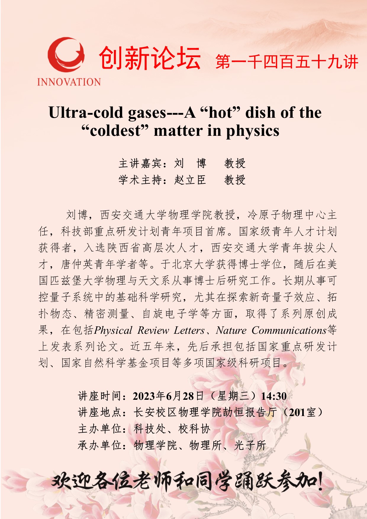 刘 博 教授 BB平台创新论坛第一千四百五十九讲:Ultra-cold gases---A “hot” dish of the “coldest” matter in physics 讲座时间 2023年6月28日(星期三)14:30 讲座地点 长安校区物理学院劼恒报告厅(201室) 讲座人介绍 刘 博 教授 讲座内容