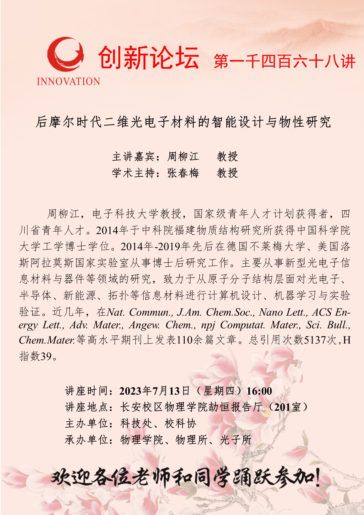周柳江 教授 BB平台创新论坛第一千四百六十八讲:后摩尔时代二维光电子材料的智能设计与物性研究 讲座时间 2023年7月13日(星期四)16:00 讲座地点 长安校区物理学院劼恒报告厅(201室) 讲座人介绍 周柳江 教授 讲座内容
