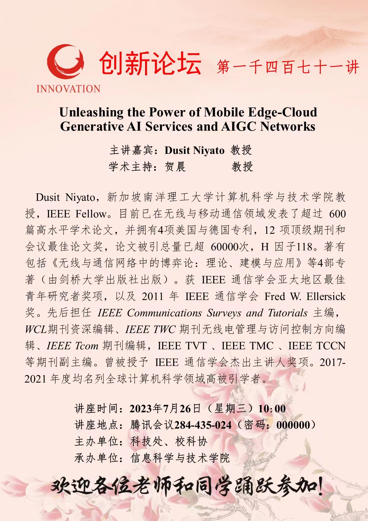 Dusit Niyato 教授 BB平台创新论坛第一千四百七十一讲:Unleashing the Power of Mobile Edge-Cloud Generative AI Services and AIGC Networks 讲座时间 2023年7月26日(星期三)10:00 讲座地点 腾讯会议284-435-024(密码:000000) 讲座人介绍 Dusit Niyato 教授 讲座内容