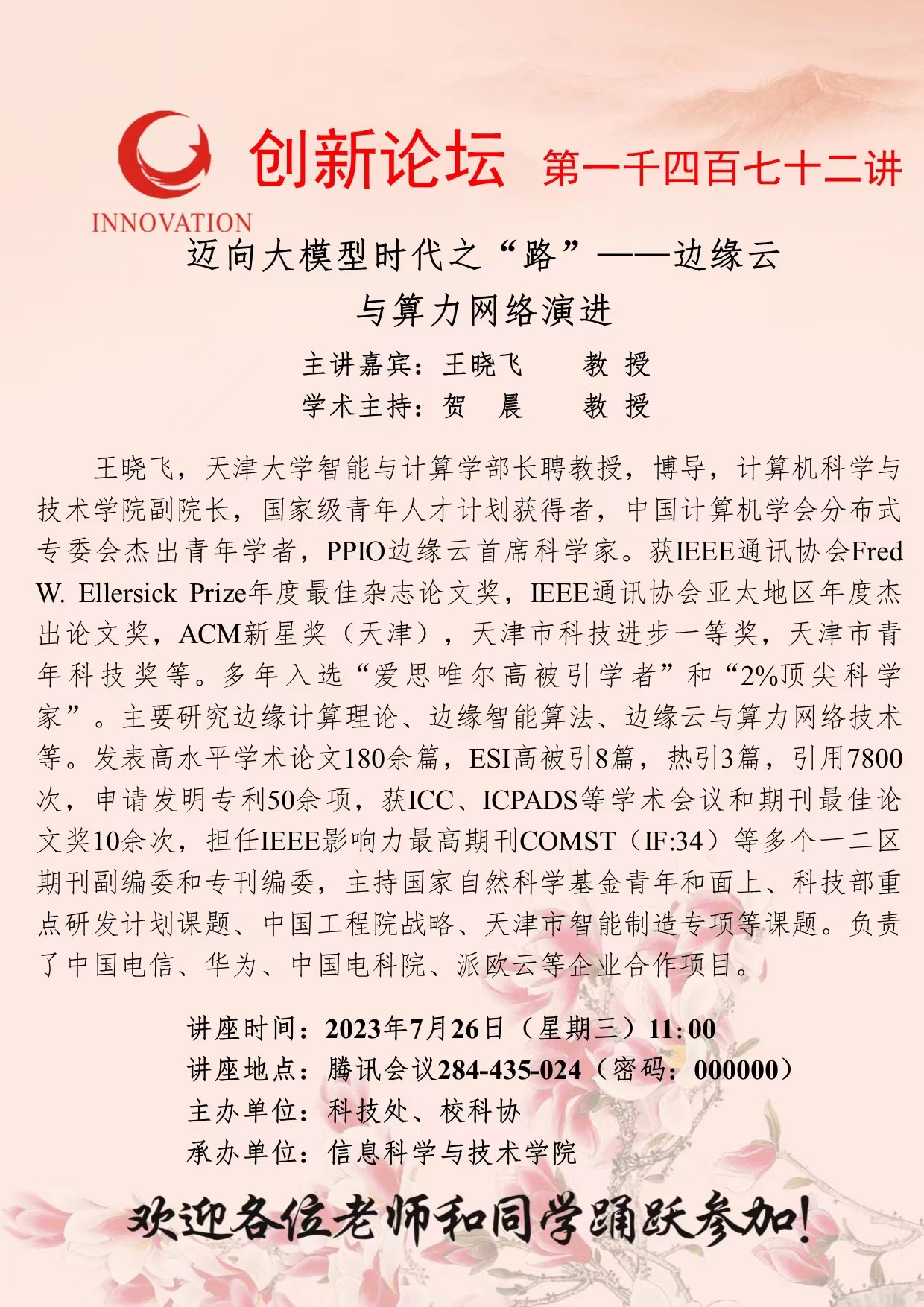 王晓飞 教授 BB平台创新论坛第一千四百七十二讲:迈向大模型时代之“路”—边缘云与算力网络演进 讲座时间 2023年7月26日(星期三)11:00 讲座地点 腾讯会议284-435-024(密码:000000) 讲座人介绍 王晓飞 教授 讲座内容