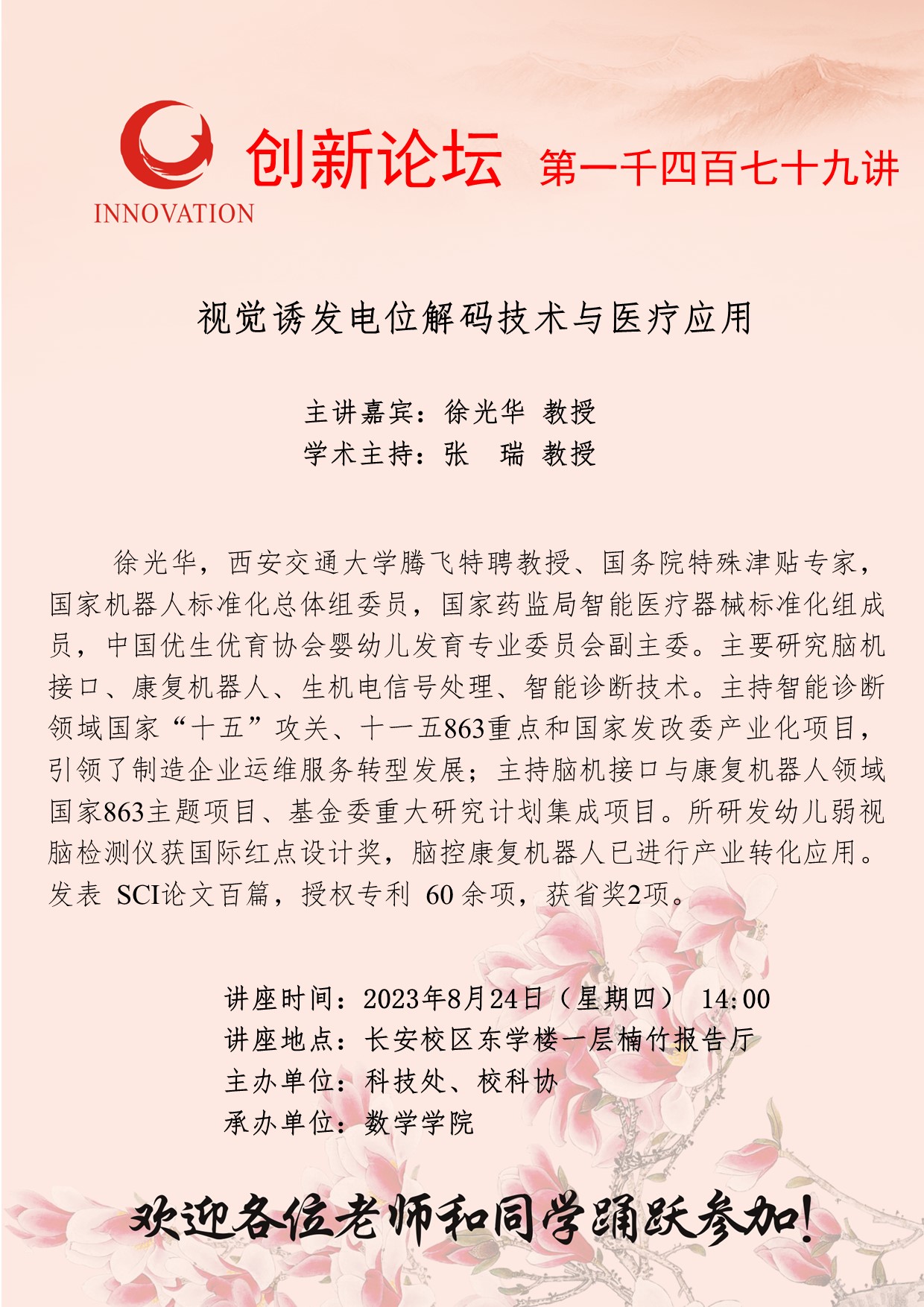 徐光华 教授 BB平台创新论坛第一千四百七十九讲:视觉诱发电位解码技术与医疗应用 讲座时间 2023年8月24日(星期四) 14:00 讲座地点 长安校区东学楼一层楠竹报告厅 讲座人介绍 徐光华 教授 讲座内容