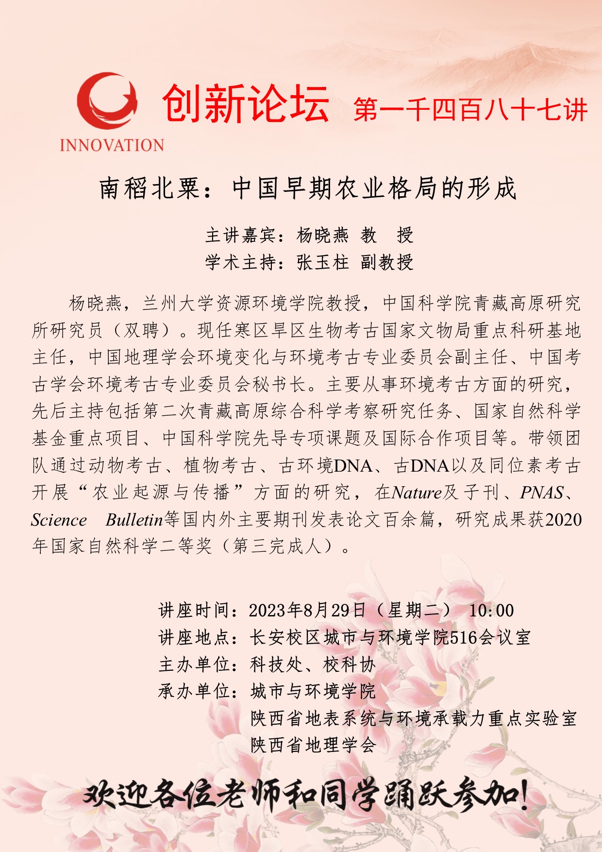 杨晓燕 教授 BB平台创新论坛第一千四百八十七讲:南稻北粟:中国早期农业格局的形成 讲座时间 2023年8月29日(星期二) 10:00 讲座地点 长安校区城市与环境学院516会议室 讲座人介绍 杨晓燕 教授 讲座内容