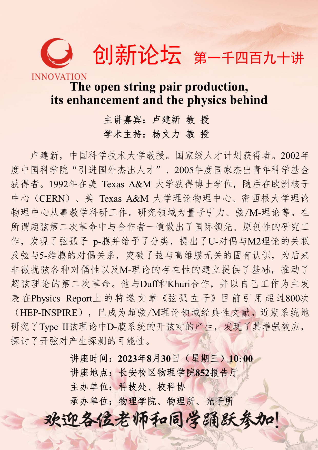 卢建新 教授 BB平台创新论坛第一千四百九十讲:The open string pair production, its enhancement and the physics behind 讲座时间 2023年8月30日(星期三)10:00 讲座地点 长安校区物理学院852报告厅 讲座人介绍 卢建新 教授 讲座内容
