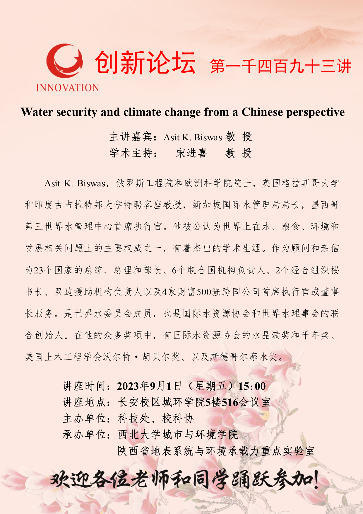 Asit K. Biswas 教授 BB平台创新论坛第一千四百九十三讲:Water security and climate change from a Chinese perspective 讲座时间 2023年9月1日(星期五)15:00 讲座地点 长安校区城环学院5楼516会议室 讲座人介绍 Asit K. Biswas 教授 讲座内容