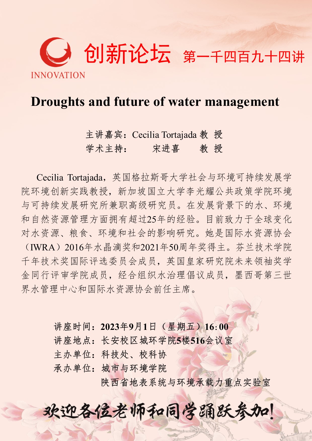 Cecilia Tortajada 教 授 BB平台创新论坛第一千四百九十四讲:Droughts and future of water management 讲座时间 2023年9月1日(星期五)16:00 讲座地点 长安校区城环学院5楼516会议室 讲座人介绍 Cecilia Tortajada 教 授 讲座内容