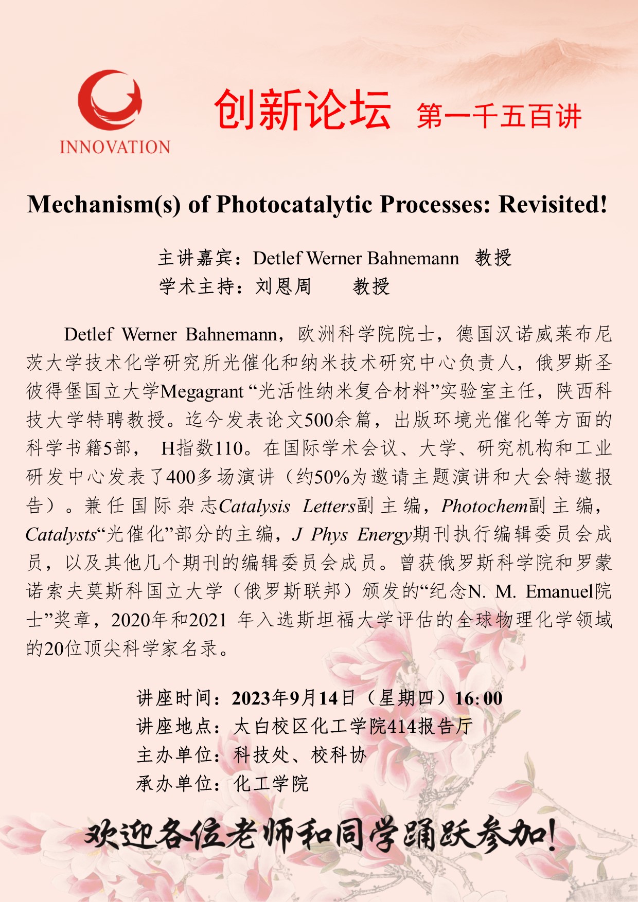 Detlef Werner Bahnemann 教授 BB平台创新论坛第一千五百讲:Mechanism(s) of Photocatalytic Processes: Revisited! 讲座时间 2023年9月14日(星期四)16:00 讲座地点 太白校区化工学院414报告厅 讲座人介绍 Detlef Werner Bahnemann 教授 讲座内容